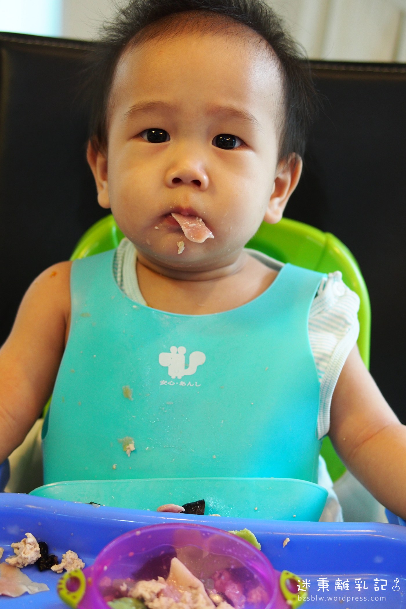 迷秉瞧了雙色板麵一眼,首先直攻那四顆搶眼的大肉丸,再來抓了幾朵黑木耳丟嘴裡嚐嚐,最後才光顧那醜不拉嘰的疙瘩板麵。^^ 麵團經過了充足的休麵鬆弛,吃起來口感相當Q彈順滑,迷秉轉眼便吃了個七七八八。我一時興起,讓孩子試著手捧小碗將小嘴靠攏直接喝湯。結果「Sob」的一聲,迷秉赫然抬頭瞪大了眼一臉錯愕看著我,愣了半响跟著嚎啕大哭起來!呵呵,第一次讓湯水給嗆到了,都是媽咪不好,歹勢啦! ( T_T)\(^-^ )
