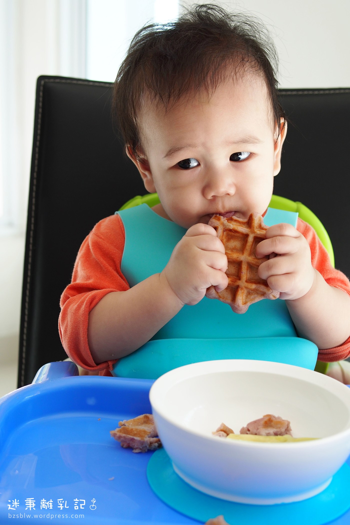 正當人家在廚房裡忙碌之際,迷秉聞香爬了進來,像隻饞嘴的小花貓依偎一旁,等著媽咪「有所表示」。呵呵!好吧,說好就只一塊喔,剩下的等上了餐桌以後媽咪再給OK?接過了窩夫,迷秉興奮地抬起頭咧開嘴,笑得只見半顆牙不見眼。(^^;; 就這樣,第一片窩夫讓迷秉給「就地解決」了!這孩子意猶未盡,上了餐桌以後繼續扒多了兩片窩夫,這才心滿意足甘願收手。