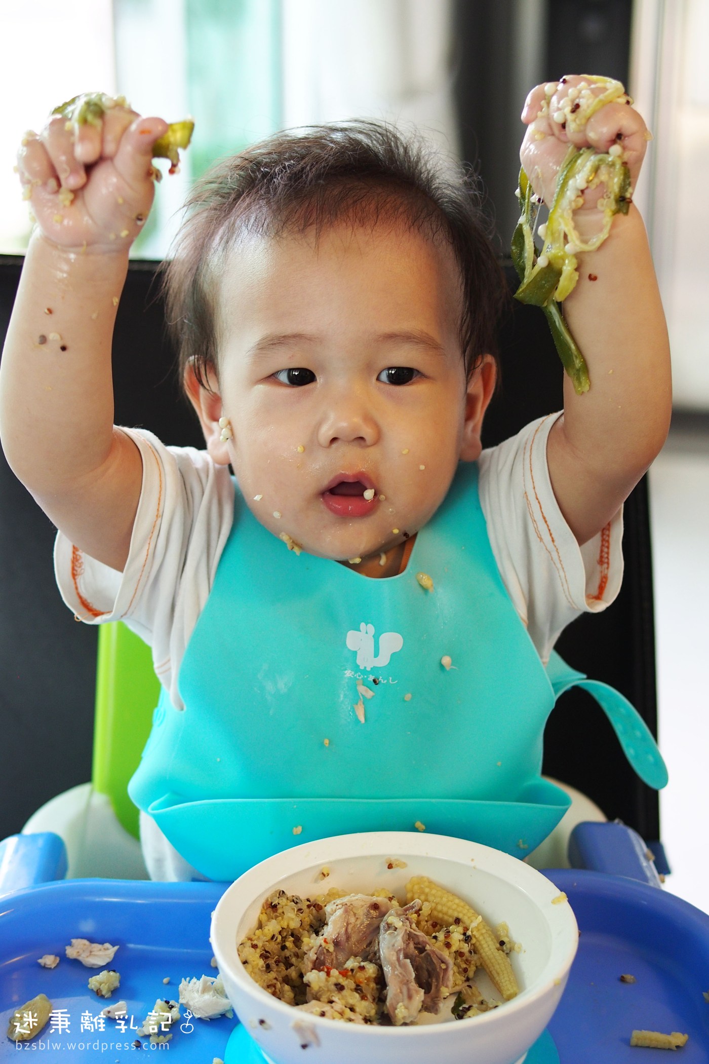 這次的蒸雞肉,口感比上回的燉雞腿實在是差太多了!儘管迷秉已經很努力啃了,但雞肉塊依然是紋風不動毫髮無損。迷秉只好放棄,回頭撿起之前咬過的羊角豆繼續磨蹭。結果這一使力,羊角豆的外皮裂開,裡頭黏糊糊的小荳荳們興奮地跑了出來,跟著與小米小小米們一同攜手在孩子臉上肆無忌憚地歡樂遊走!☆*:.。. o(≧▽≦)o .。.:*☆