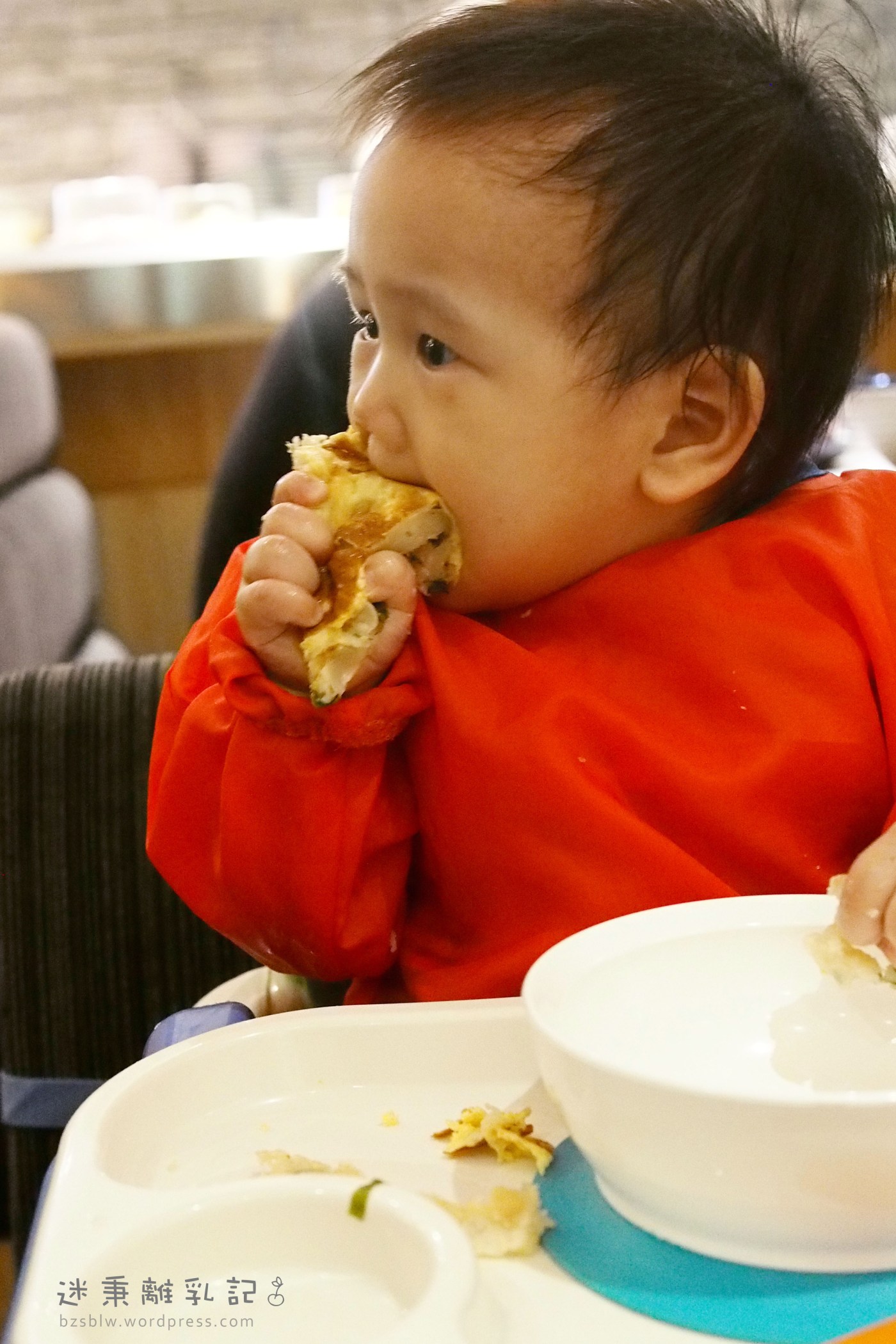 搞了半天,終於讓迷秉入座與大夥兒一同開動。迷秉就坐在這桌子旁的走道上,身後不時有服務生來回勤走,害得他也跟著非常忙碌左看右看上看下看的。總算他沒忘了手中的蔥花蛋餅,「忙碌」之餘還是大口大口地將蛋餅啃完。BLW最讓人欣慰的地方,莫過於孩子靜靜坐著陪同大家一同進餐。迷秉是吃到最後的一位,前後啃掉了四片的蔥花蛋餅,其他的蔬果也吃得七七八八的,我看著都覺得好飽哦!果然晚餐以後一上車子,這孩子奶都省了像斷電一樣呼嚕嚕地一覺睡到天亮!^^