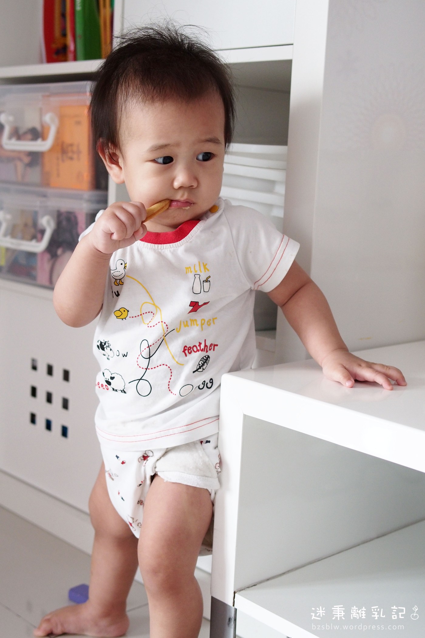剛出爐的麵包棒熱呼呼的,外酥內軟的口感讓人有小小驚喜。湊鼻一聞,還透著淡淡的椰香味。冷卻以後的麵包棒就帶了點嚼勁,不會硬哦!這小小麵包棒個個長得跟咱們手指一般大小,迷秉握在手裡正好再小巧不過了。有了它們,你這小子休想再啃媽咪手指頭了!(^_^)v  麵包棒果然是寶寶磨牙與消磨時光的好夥伴,僅僅一小根足以讓迷秉乖乖坐著啃上好幾分鐘。迷秉最近邁開大步學自立走路了,呵呵,這麵包棒吃起來不會像一般的寶寶餅乾那般的糊化災難,正好讓他走到哪兒吃到哪兒。少了空間的束縛感,適度的放任反而讓孩子吃得更自在享受哪!^^