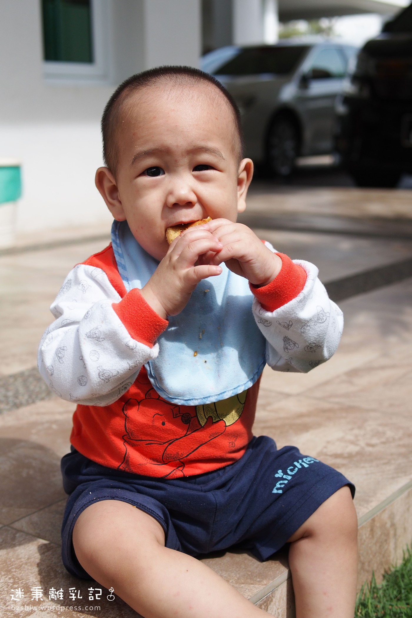 吃沒幾口,這小子便吵著要起身。我看外頭陽光普照天氣不錯,於是便將他解放讓他自由活動。結果這小子一手抓著烤雞肉塊,像隻快樂的小鴨子興奮地走出屋外,頂著暖暖的陽光由石磚地坐到了草地,跟著又光著腳丫腳步蹣跚地走向爸爸的車子繞了一圈,最後一屁股坐在車房裡的石灰地上,繼續享用他手上的烤雞肉塊!呵呵,這孩子,好一個「地個涼,地個坐」哪!σ^_^;