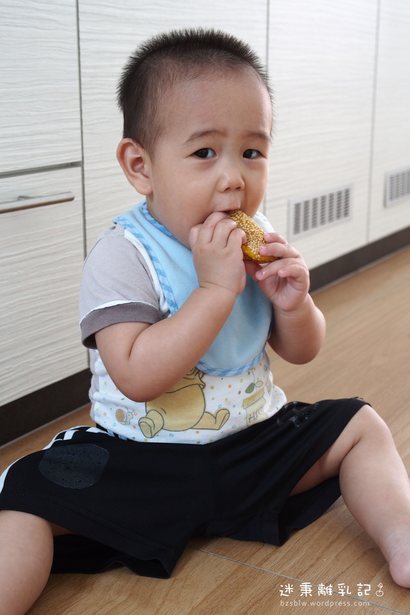 我在廚房裡忙著的時候,迷秉因為錯過了午餐時間而開始飢腸轆轆按耐不住,家婆只好先讓他喝點奶充充飢。這小子一喝完了奶,便踩著鋃鐺腳步來到後廚房,看見我在烙餅便伸長了脖子一副貪婪討吃的樣子。呵呵好吧,就一塊哦!迷秉接過了溫熱的南瓜糯米煎餅,突然感覺熾燙而一下子抽手,結果南瓜餅「啪」的一聲跌了個「狗吃屎」!(/ω\) 這小子跟著使出了「鐵沙掌」直接在地板上將煎餅翻來覆去地「快炒」一番,不燙手了以後這才抓起往嘴裡送。 第一次吃糯米料理,口感QQ的,迷秉大愛喔! 這小子跟著像個「量地官」似的在廚房裡踱來踱去好不忙碌,還不忘回頭細嚐手中的美妙滋味,十足好吃懶做假神氣的模樣!(≧∇≦)