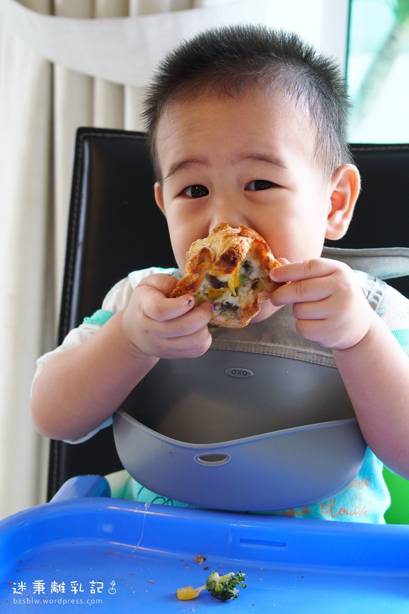 這「吐司烤盅」一上桌,迷秉一如既往地用手指探了探看似陌生的食物一下,跟著由裡頭摘了朵西蘭花毫不猶豫地往嘴裡丟。當下我又驚又喜,這小子好久都不曾看這「帶綠帽子的傢伙」一眼了,難得今天還「大開門戶」的,叫人怎能不激動呢?(*☻-☻*) 今天早上孩子們的外婆也抽空過來坐坐,她老人家見迷秉不急不緩一口接一口地將偌大的吐司盅給啃個精光,跟著再吃了三分一她老人家親手製作的香煎芋頭,外加一顆桃子以及十來顆的藍莓,當下看得頻頻搖頭直呼「夠了夠了飽到下午去了~」!(≧▽≦)