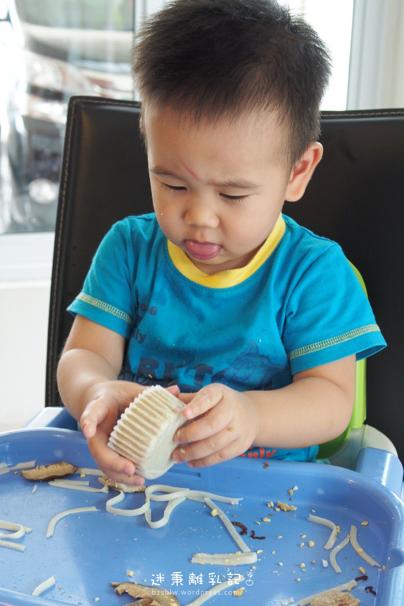 於是我收起了麵條,給迷秉遞上一個剛蒸好的小蛋糕。迷秉抓起了蛋糕,吐出了舌頭,皺起了眉頭,想盡辦法將蛋糕屁股上的烘烤紙模給去除。ಠ_ಠ 呵呵,這孩子自小一旦鬼頭鬼腦時就是這麼一副德性!只見那蛋糕在迷秉的抓抓捻捻之下七零八落傷痕累累的,最後成功吃下肚裡的應該也不過是那二分一所剩無幾滿目蒼夷的「殘骸」罷了!σ^_^;