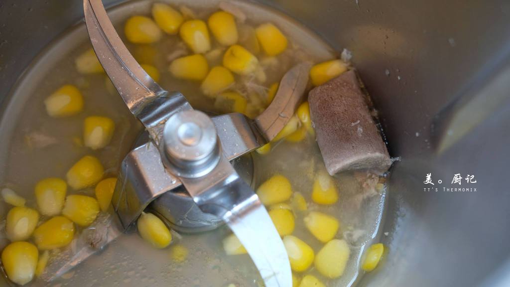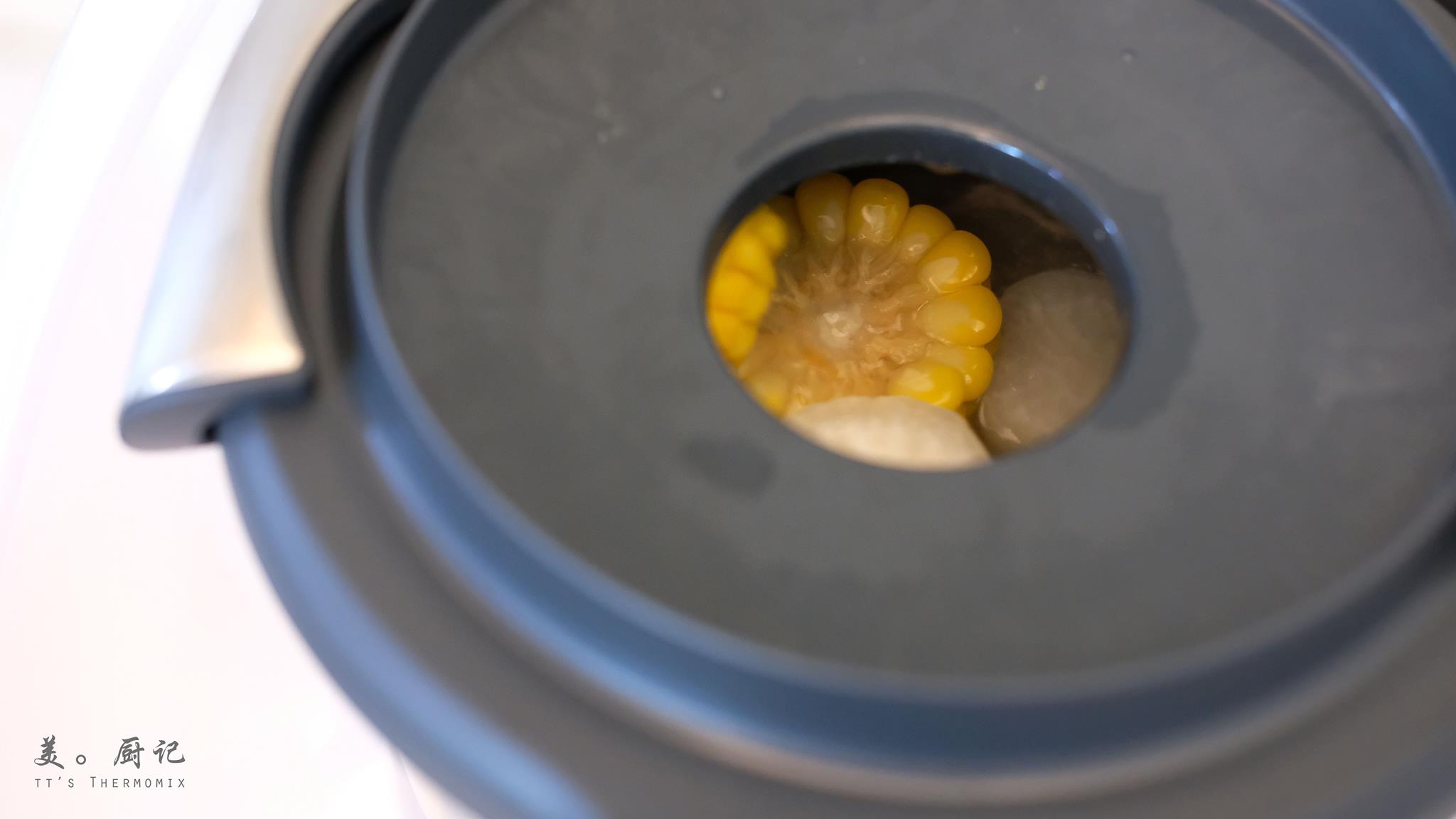 3. 打開量杯加入白蘿蔔和玉米,設定【45分/100℃/反轉/小勺柔速】進行烹煮,跟著蓋上量杯。