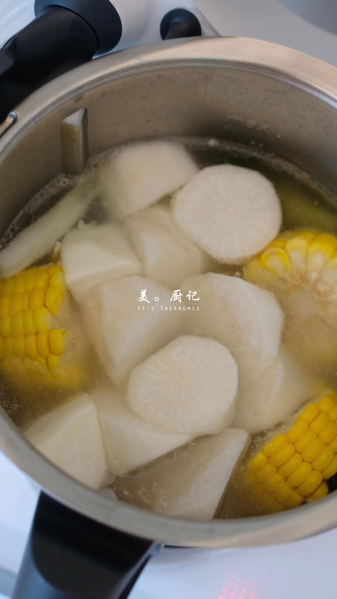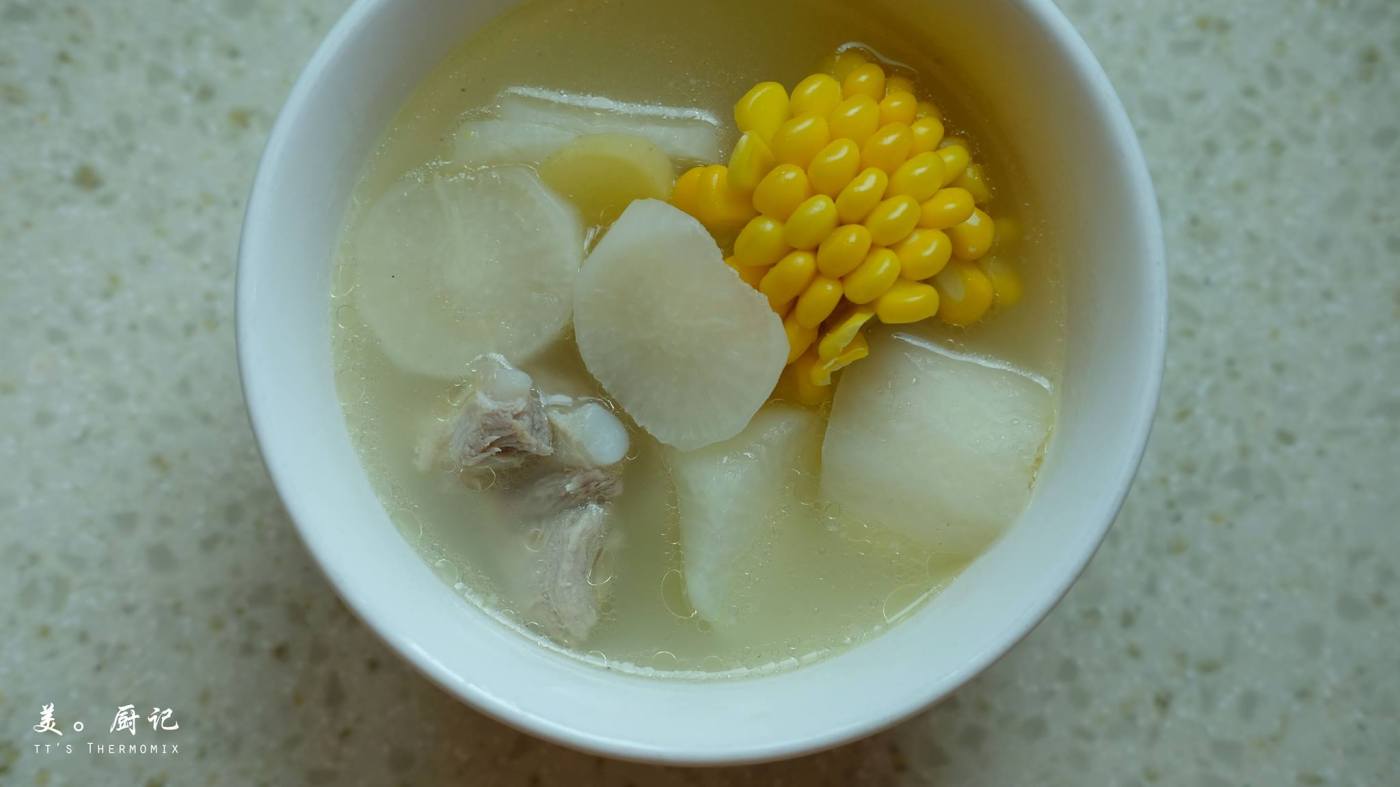 白蘿蔔 1棵(切塊) / 玉米 1根(切段) / 排骨 6塊 / 薑 10g / 蔥 1棵 / 料酒 10g / 水 1200g / 海鹽 適量 / 白胡椒粉 少許