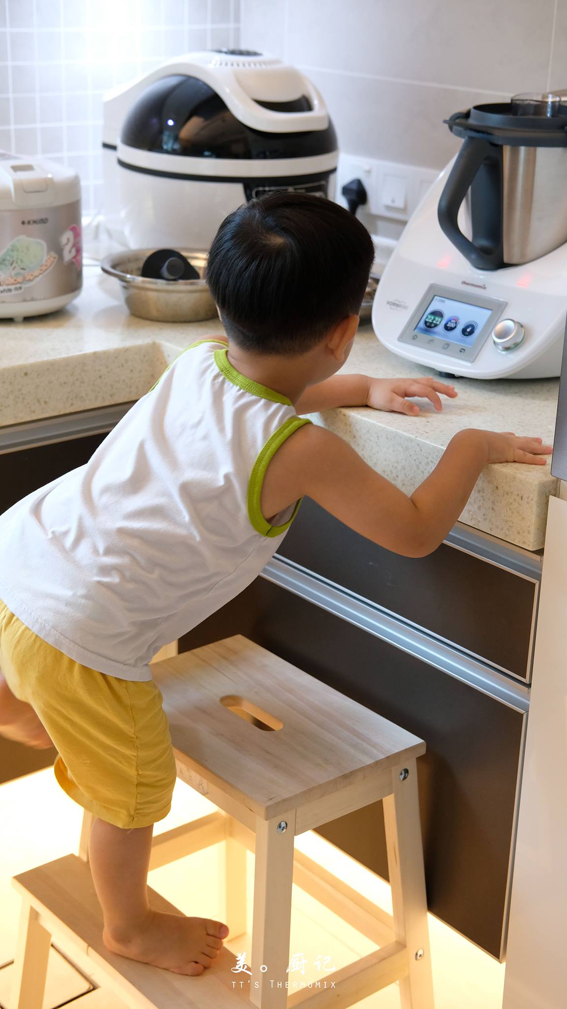貓媽妳看!都說我需要小美有Child Lock功能咯~ ٩(˃̶͈̀௰˂̶͈́)و 嫌自己不夠高,迷秉乾脆直接將小梯子搬過來好辦事。我怕一個不留神我的排骨湯會變濃湯,結果只好當守門員全程守著這傢伙就好了!=_=