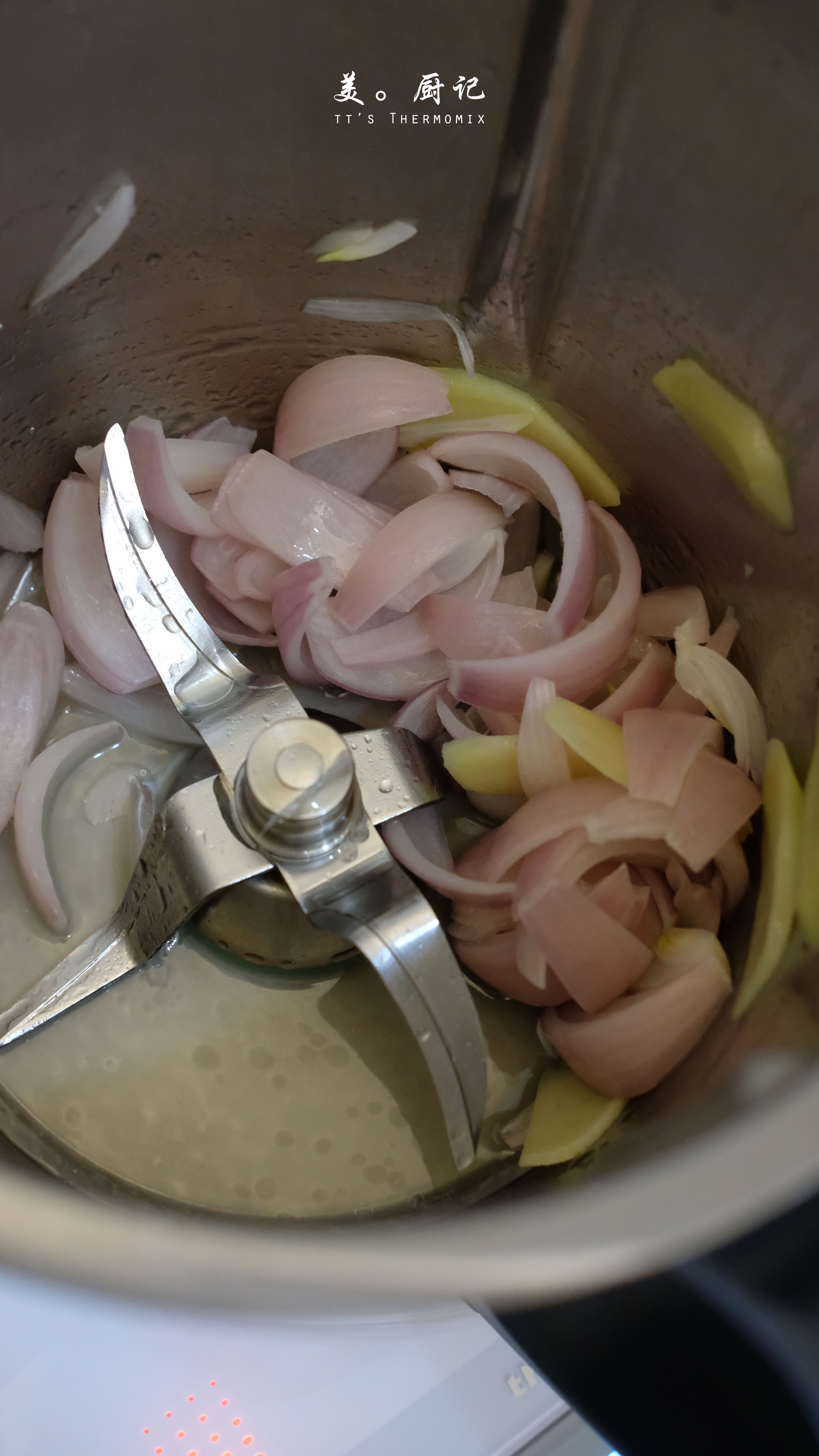 - 將油、薑片和大蔥放入主鍋內,以【5分/120°C/反轉/速度1】爆香。
