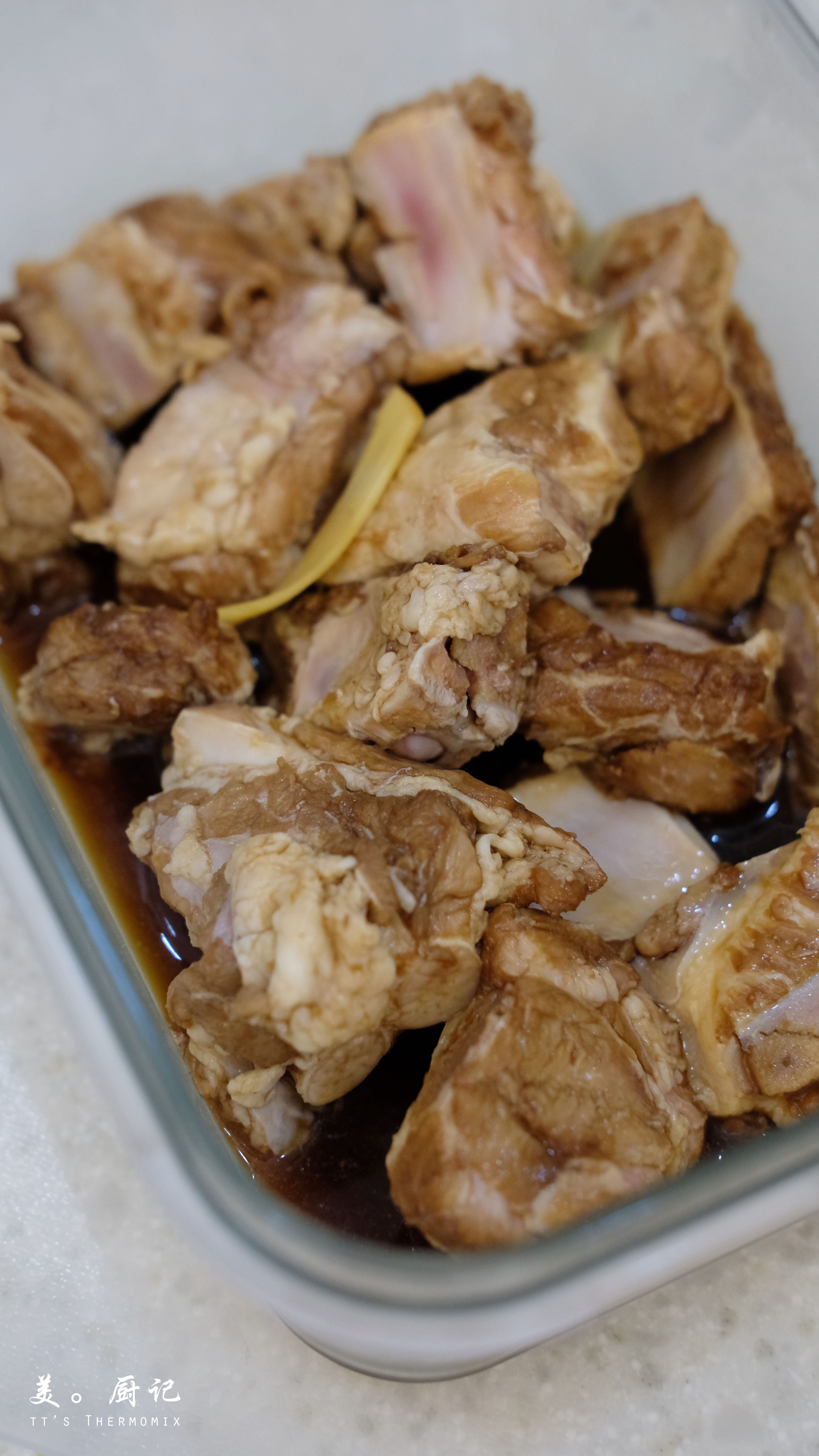 - 時間到將排骨洗淨盛入碗中,加入醬料混合均勻,跟著置入冰箱裡醃製半小時或以上。