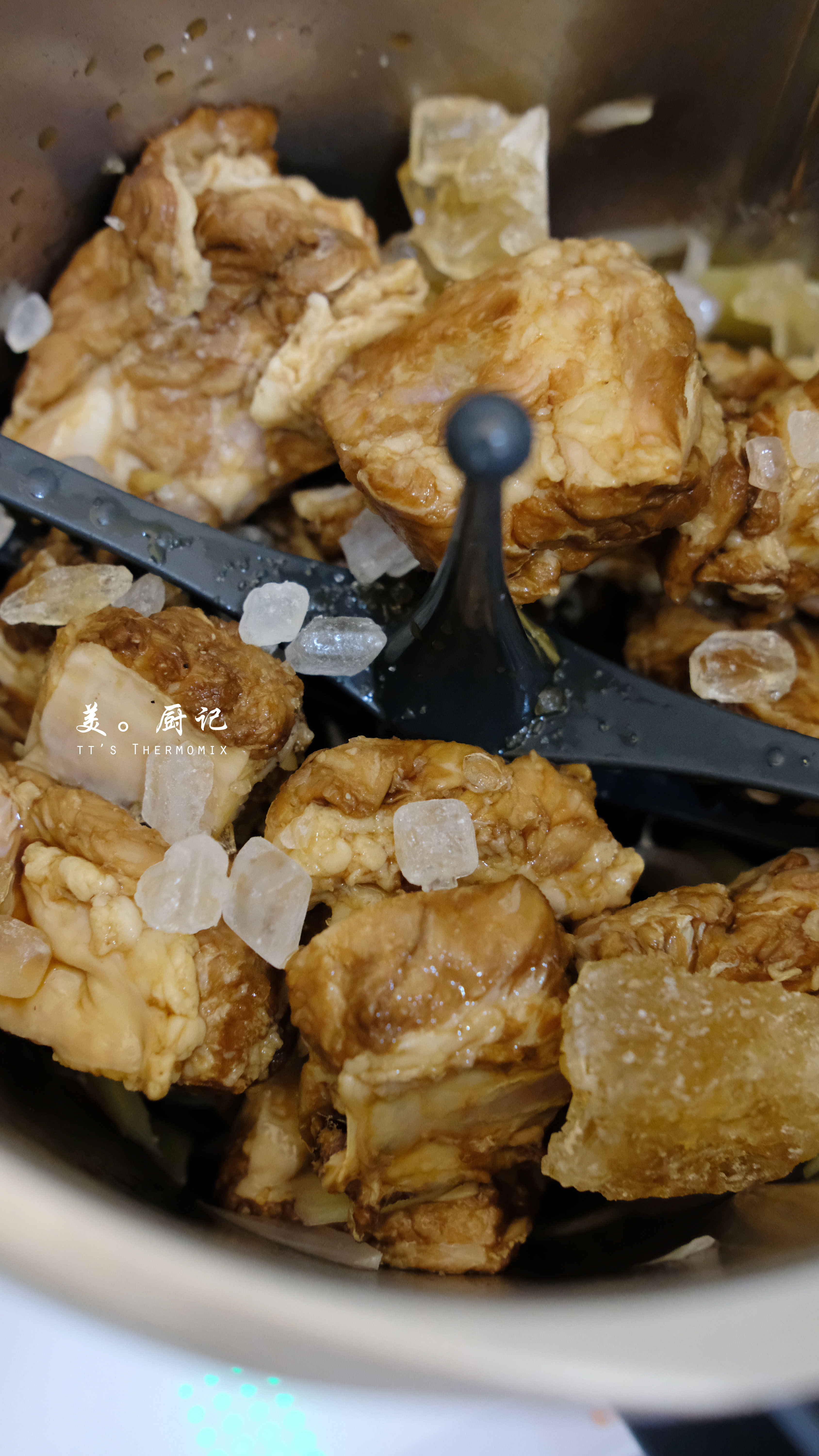 - 將作法2的排骨、醬料和冰糖倒入主鍋內,以【25分/Varoma/反轉/小勺柔速】烹煮。