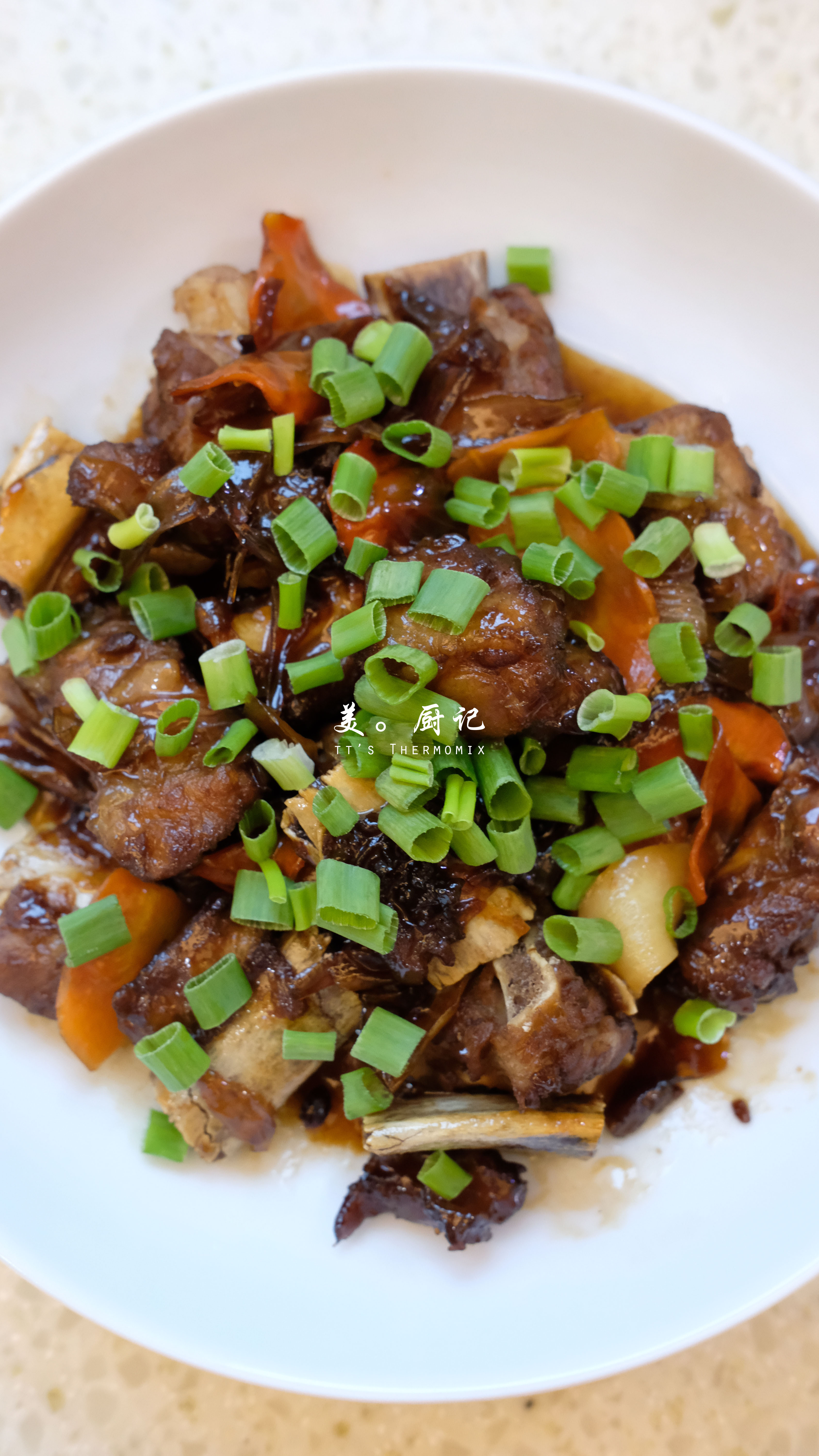 排骨 500g / 薑片 10g / 紅色大蔥 1顆(切片) / 紅蘿蔔 1/2根(切片) / 橄欖油 20g / 冰糖 50g