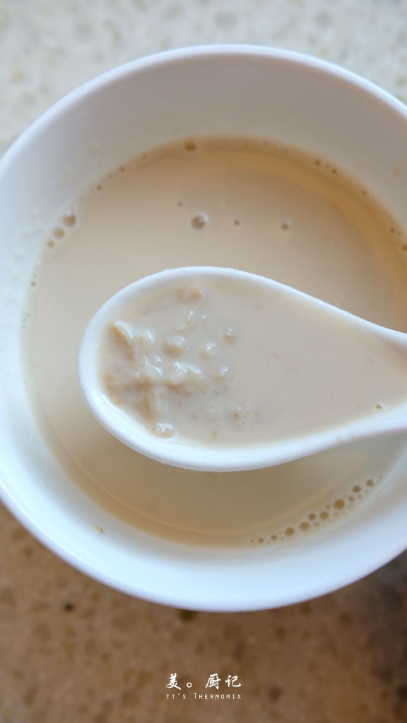 豆漿完成以後,想說給迷秉順便製作一份豆漿燕麥帶去學校喝。於是,我將約250g的豆漿倒回主鍋,跟著加入30g的粗燕麥(Rolled Oats),以5分鐘/100°C/反轉速度1烹煮。時間到,我喝了一口豆漿燕麥,瞬間像是回到了小時候喝著口感滑溜滑溜的Gandum小麥粥!這第二波的驚喜,不由得再度讓我感動得說不出話!ಥ_ಥ 看來我的九陽破壁豆漿機,真的可以收拾包袱準備走人了!(≧▽≦)