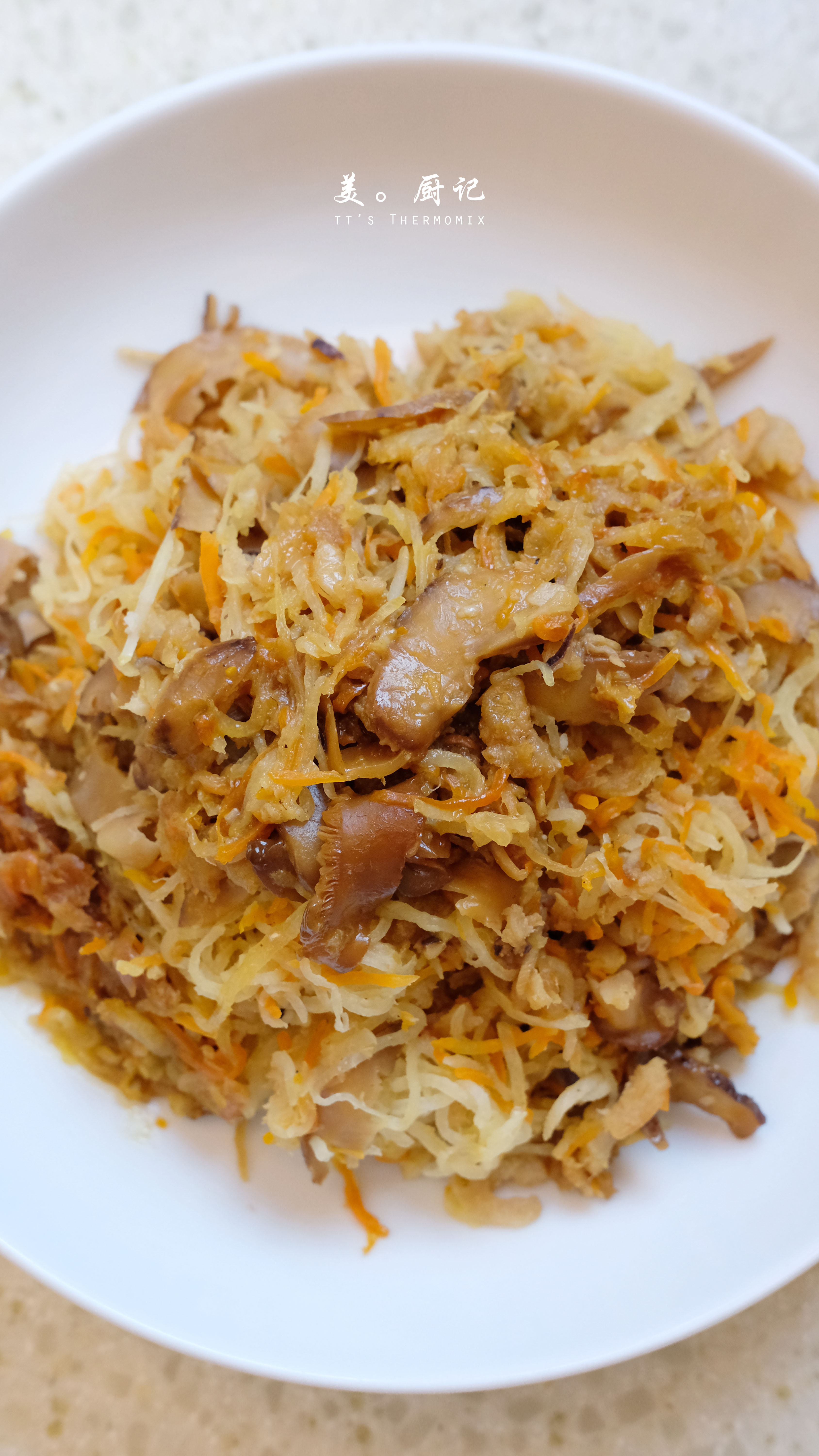 - 把魷魚絲、香菇絲和橄欖油加入主鍋,以【5分鐘/120°C/反轉/速度1】爆香。