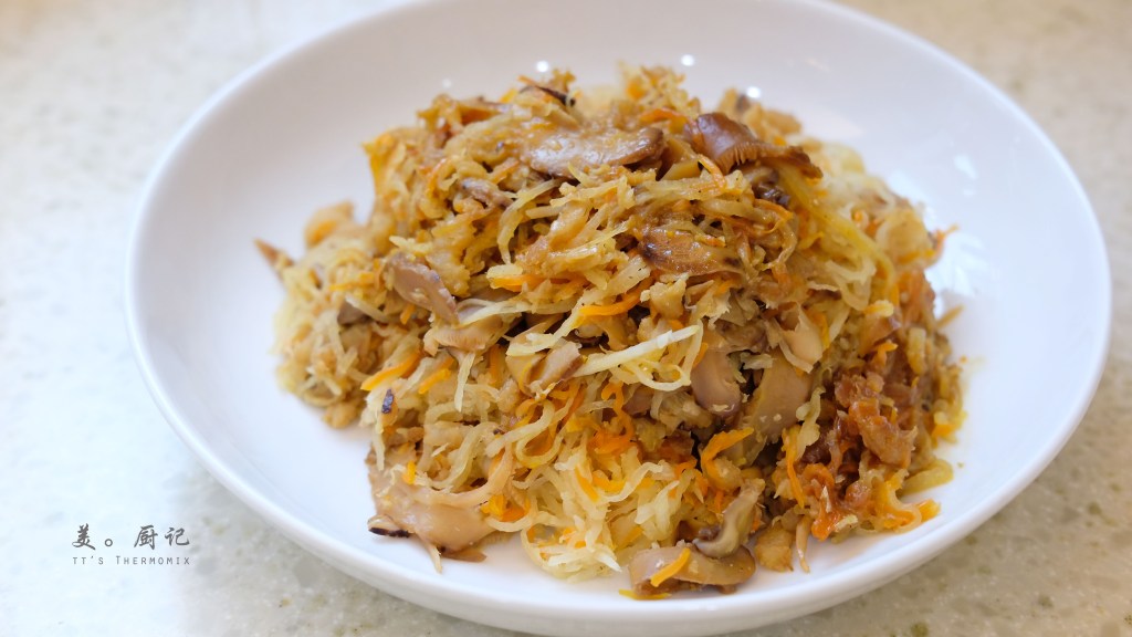 時間緊迫,我擔心用120°C烹煮的話,沒辦法在短時間內將一大鍋的沙葛炒軟,加上沙葛本身水分多,我怕還要收汁的話不懂要煮到幾點才可以開飯了。σ^_^; 最後膽粗粗想說,乾脆將小美的火候開到最大以Varoma直接烹煮同時進行收汁吧!炒了約15分鐘後開蓋一看,我發現鍋底下開始有些焦底,但沙葛已炒得差不多軟嫩而且也收汁得七七八八了。於是,我便改用120°C繼續完成後面的拌炒。