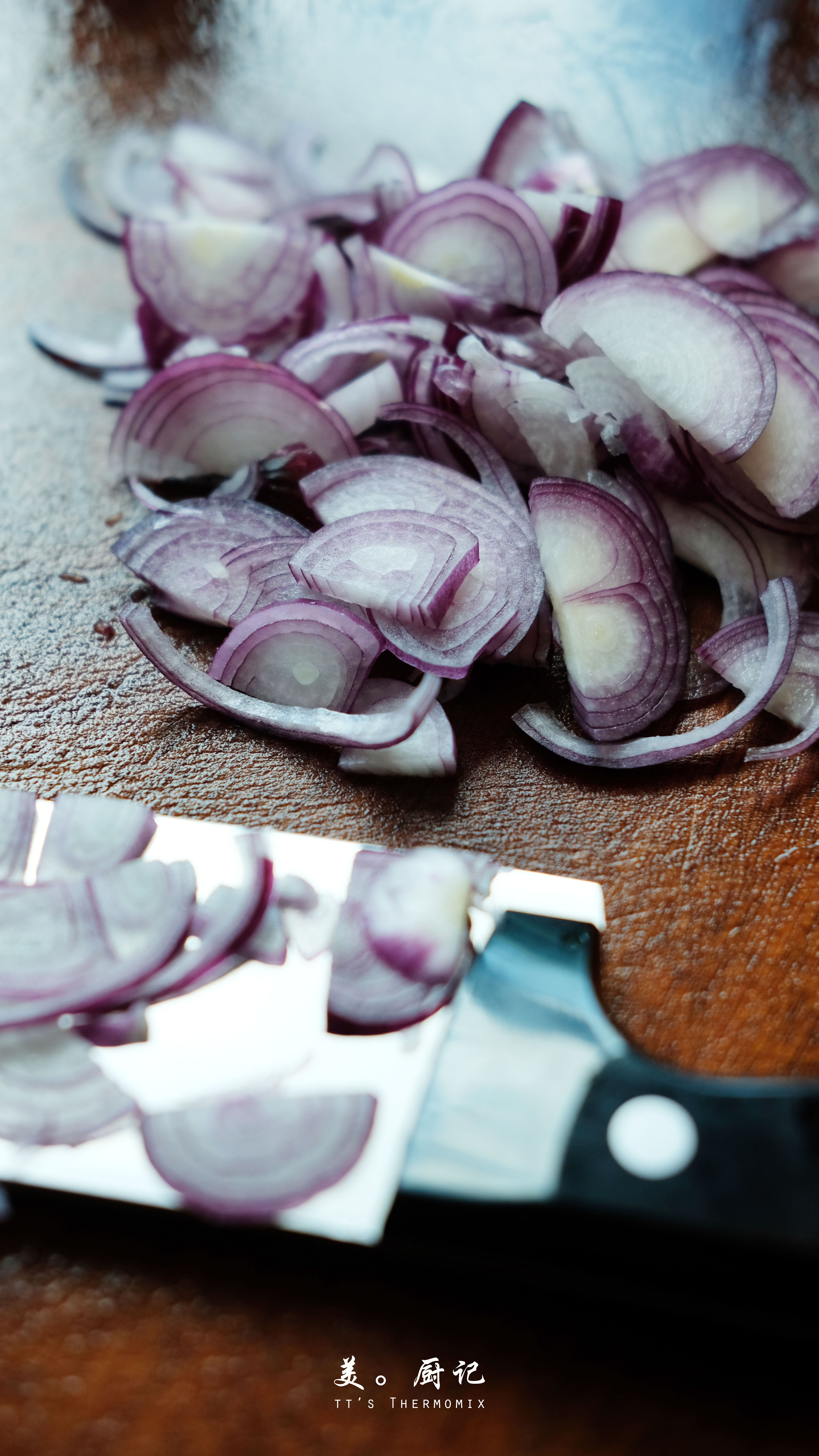 1. 將紅蔥頭與橄欖油倒入主鍋內,以【20分/Varoma/反轉/速度1】煉製油蔥酥。中途可暫停,用刮刀將卡在刀組上的蔥頭片鬆開,跟著繼續完成製作。