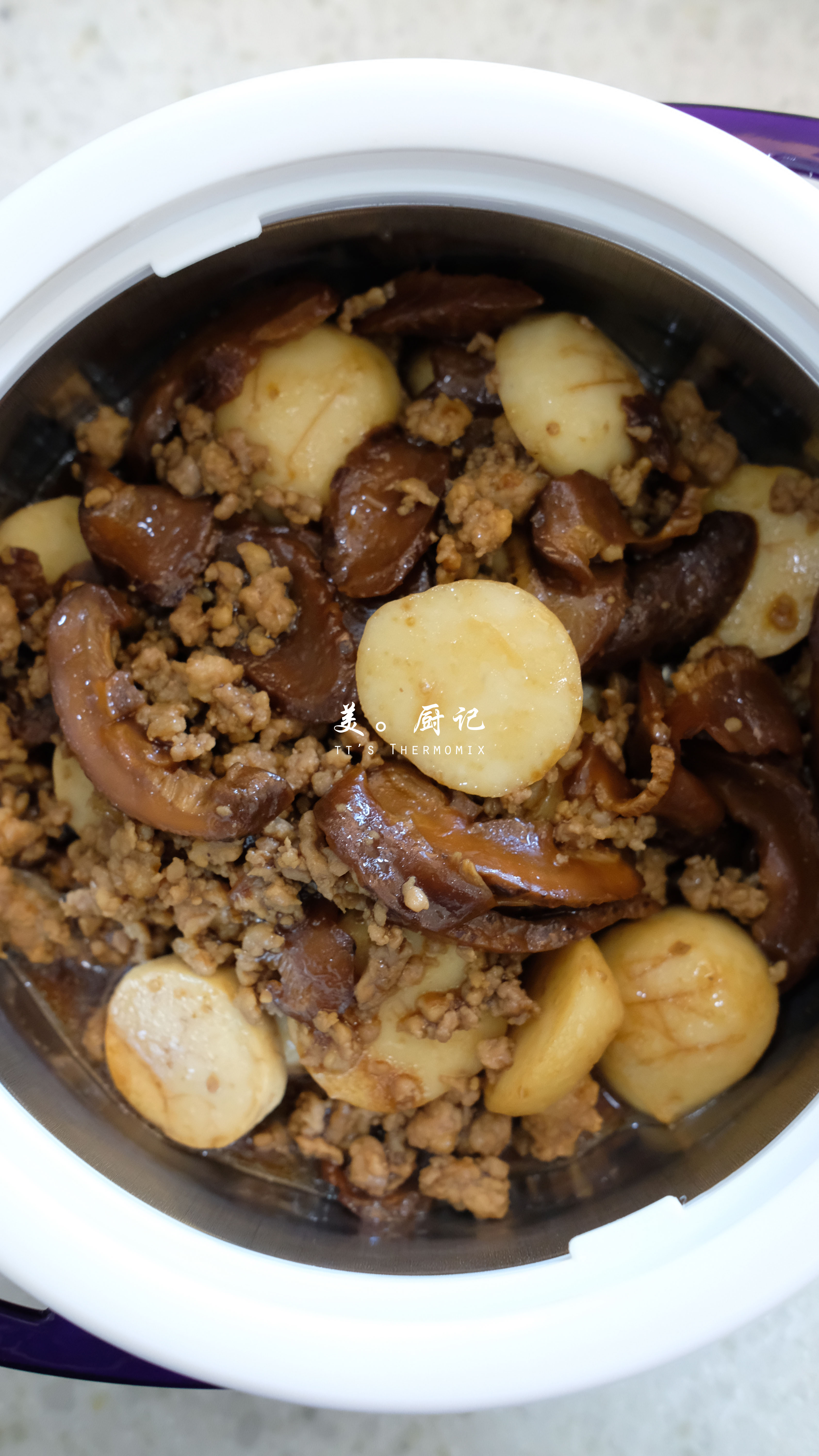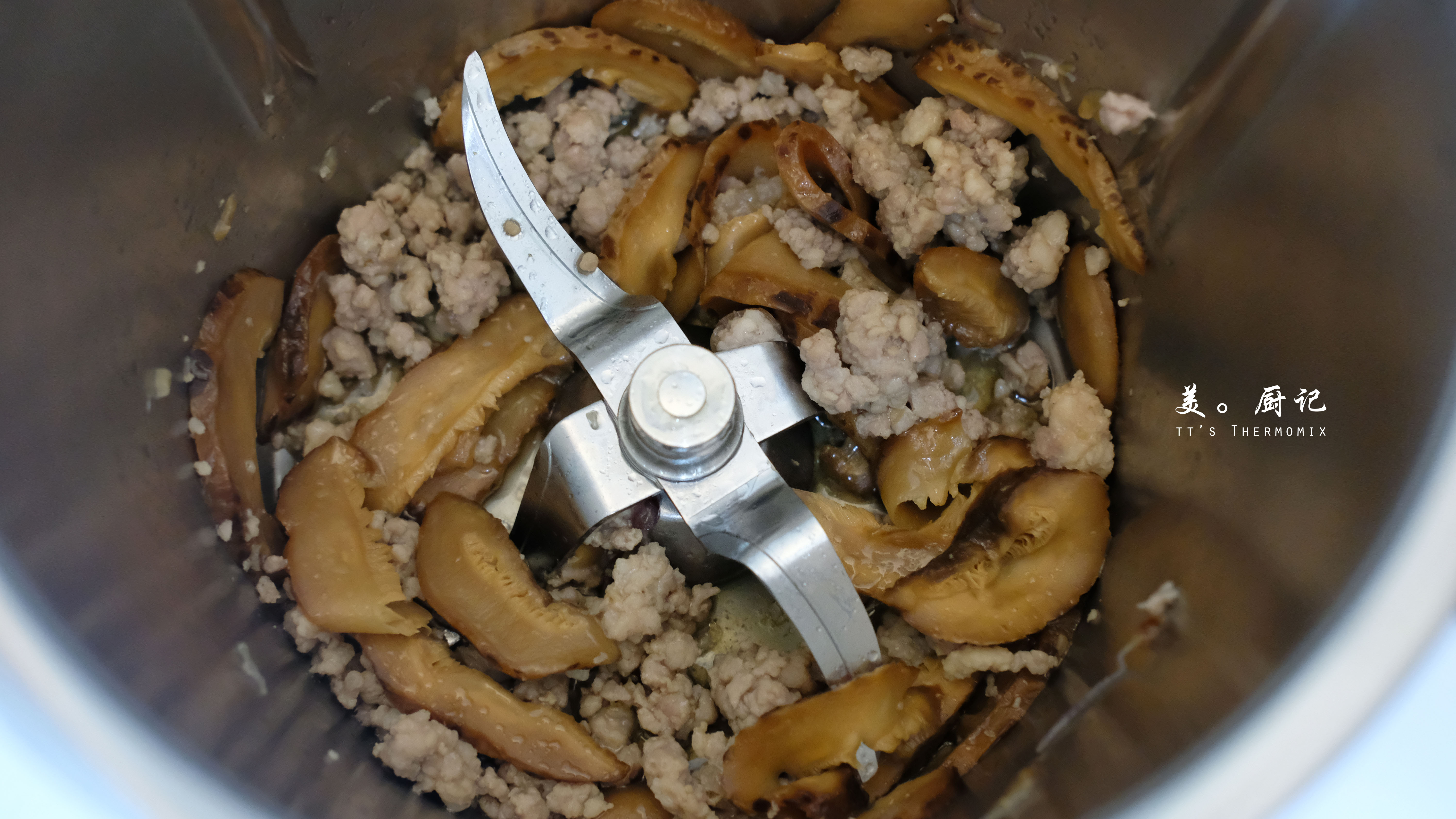 4. 將步驟2的豬肉碎加入主鍋,以【5分/120°C/反轉/小勺柔速】爆香,最後三分鐘加入香菇片繼續拌炒。