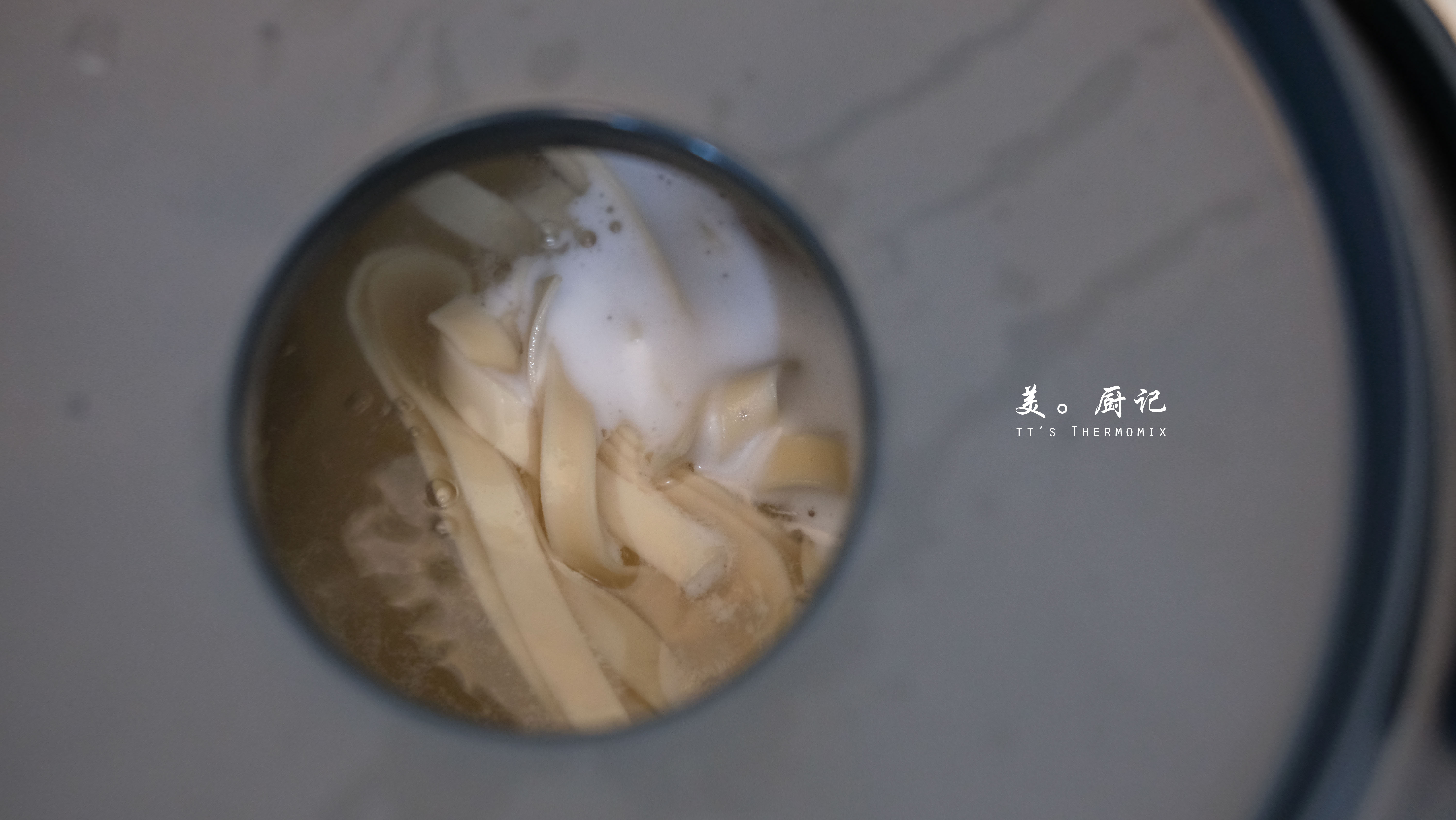 6. 將板面放入網鍋裡跟著架入主鍋內,加入清水和海鹽,以【10~12分/100°C/速度4】烹煮至麵條熟透為止。中途可用筷子透過主鍋蓋口將麵條稍微掰開攪拌一下。