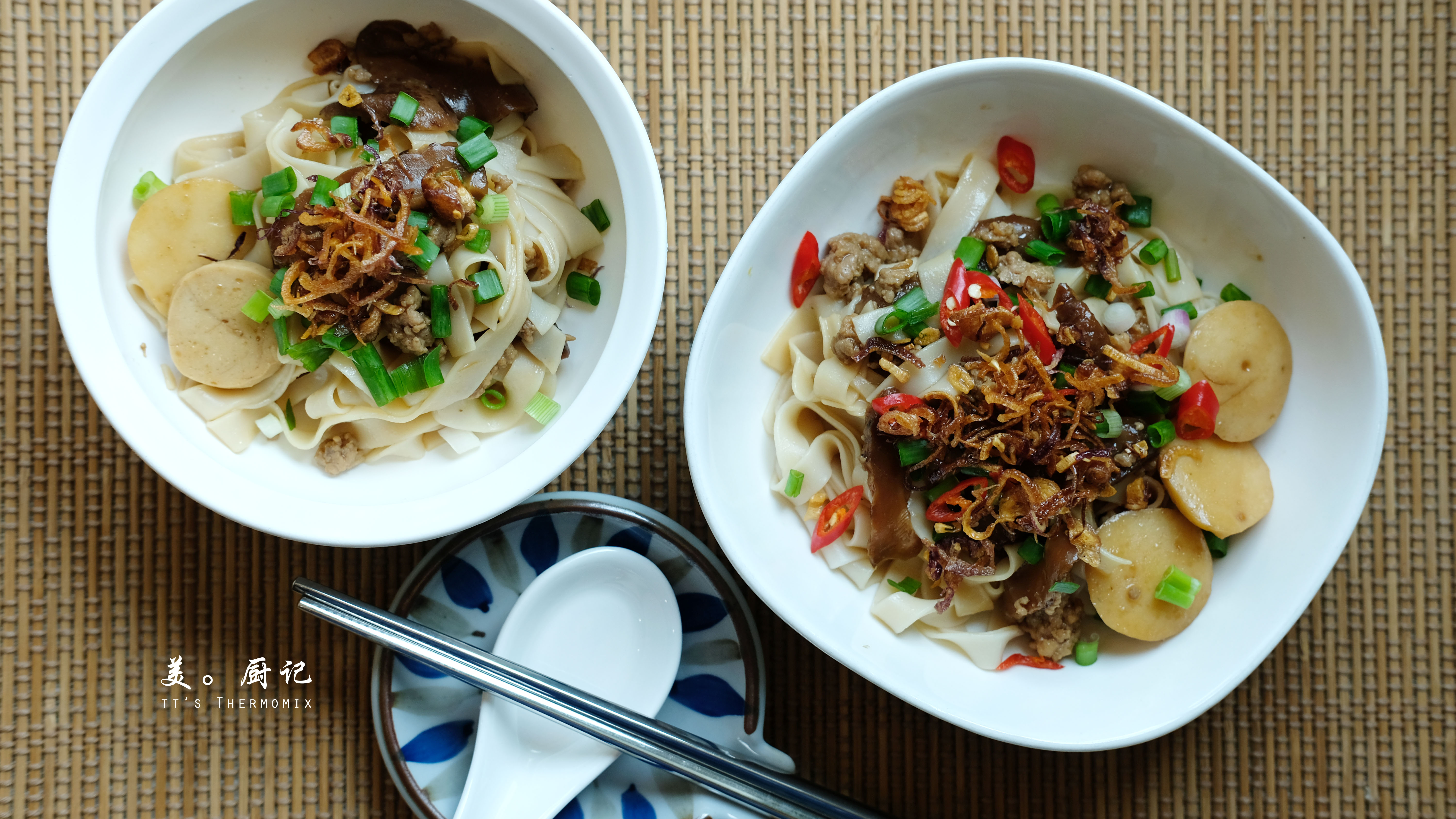 紅蔥頭 60g(切片)/ 橄欖油 60g / 豬前腿肉 100g(剁碎) /  香菇 3朵(泡軟切片) / 魚丸 6粒(切片)/ 紅色小辣椒 2條(切片去籽)/ 青蔥 1根(切蔥花) / 豆簽板面 4塊(約150g)/ 清水 約1200g (足以淹過麵條的量) / 海鹽 1/2tsp