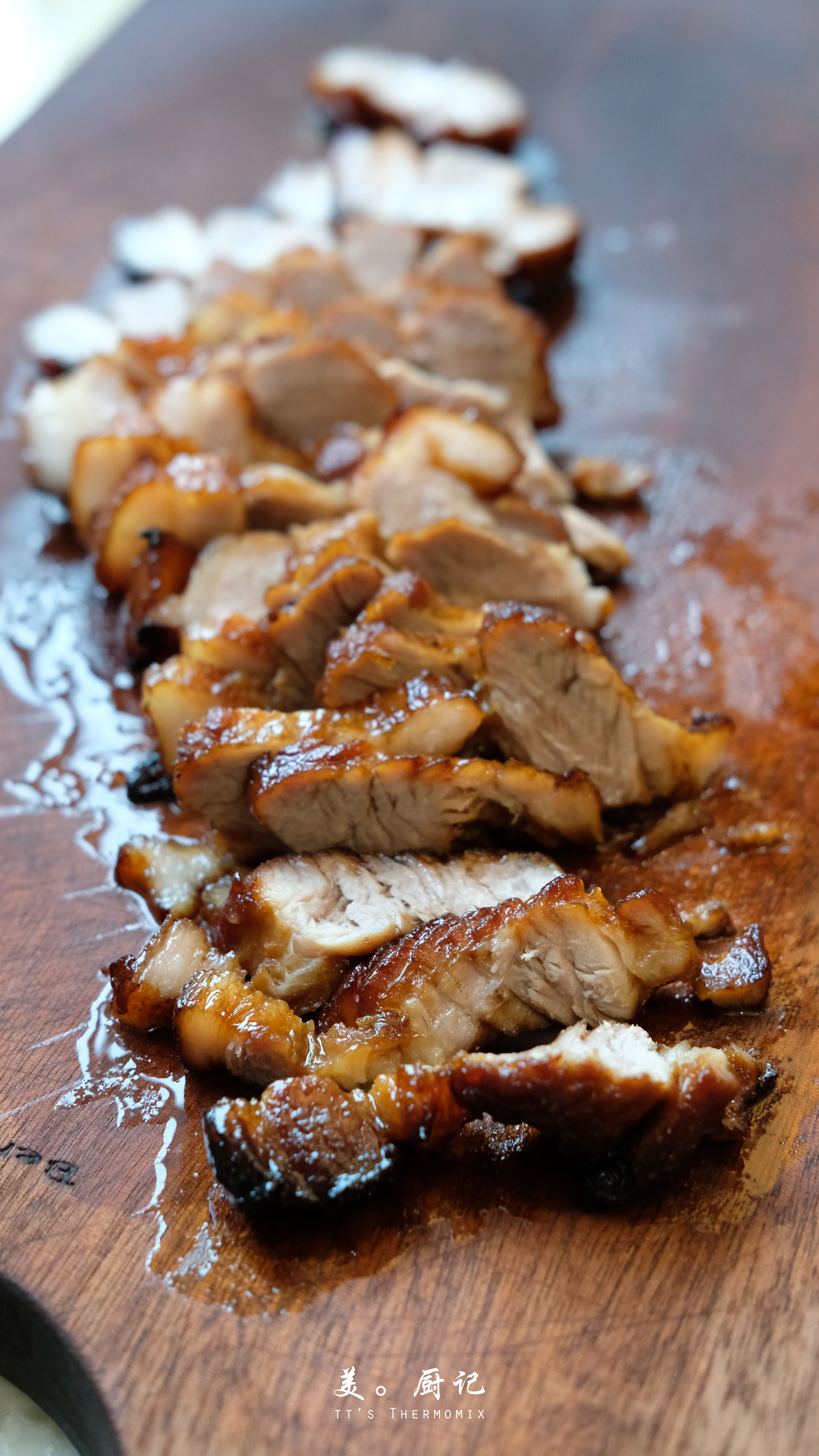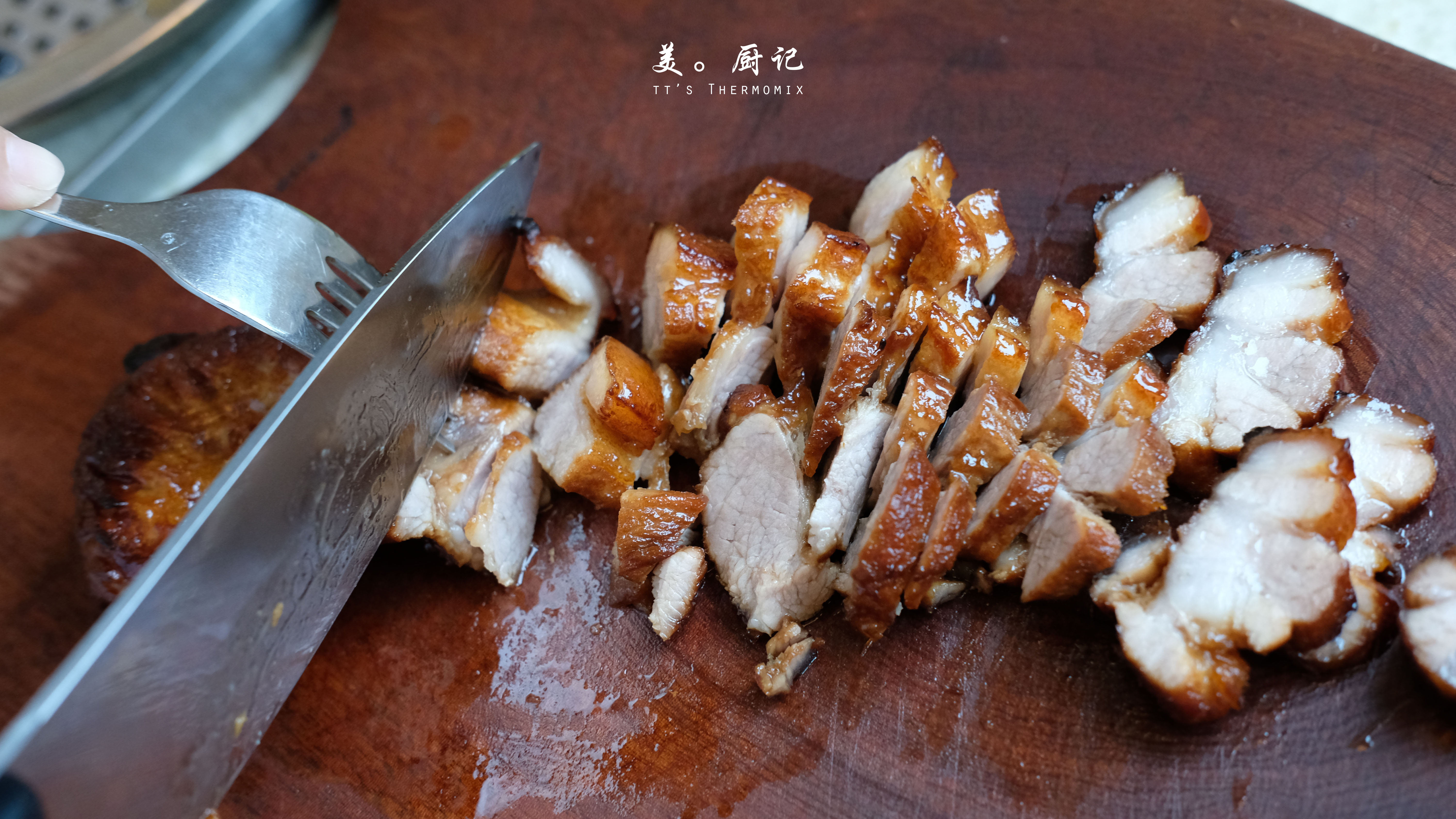 我覺得小美煮叉燒有一點不好,原本一大條長得端端正正的夾心肉,煮好後先不說短了一大截,就連身材也走了樣變成扭曲醜陋的L字型!( ・᷄ὢ・᷅ ) 好在切片以後,我的叉燒總算有番個叉燒樣,鮮嫩多汁、香氣四溢,看了直教人食指大動。(*^◯^*)