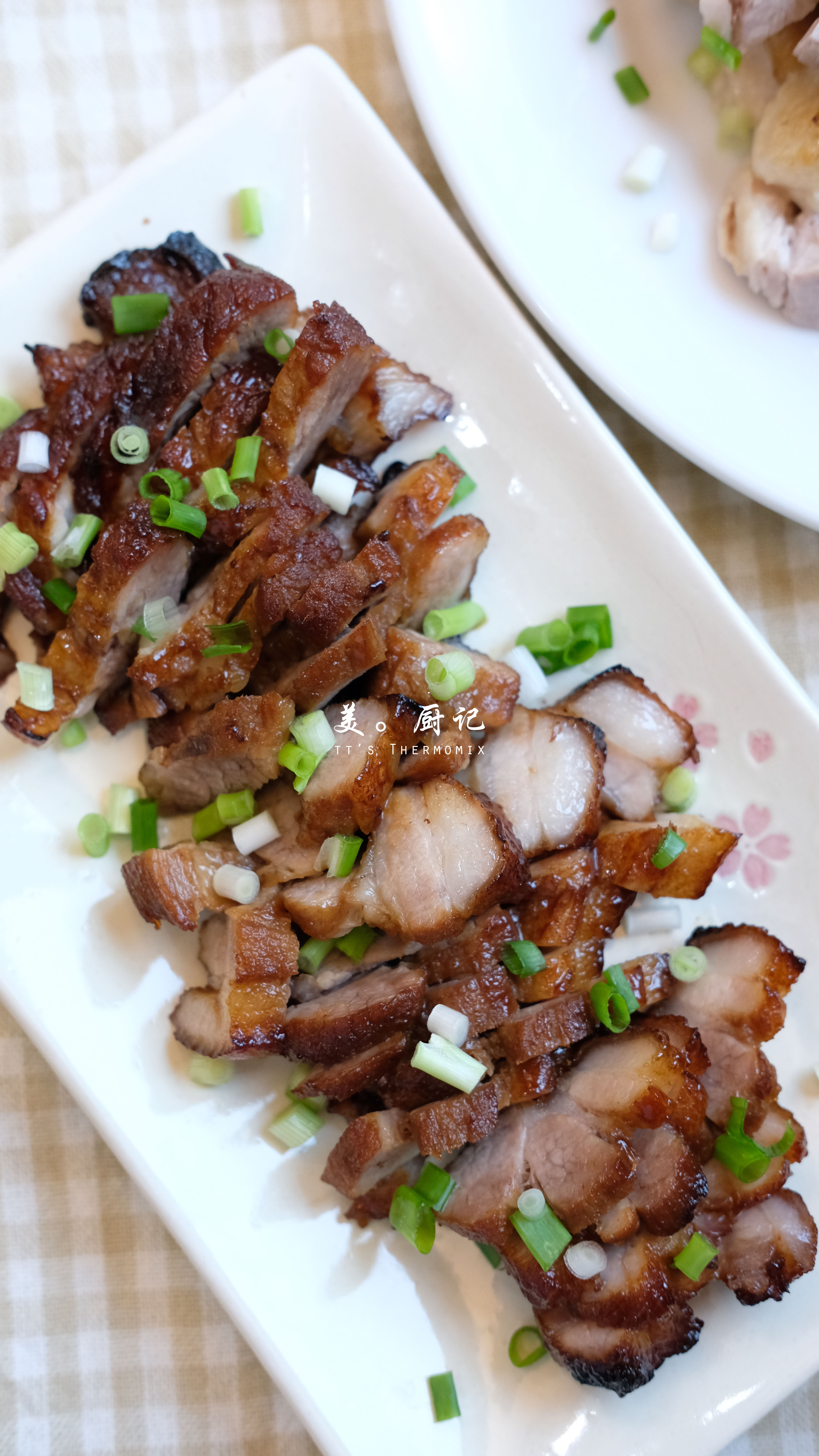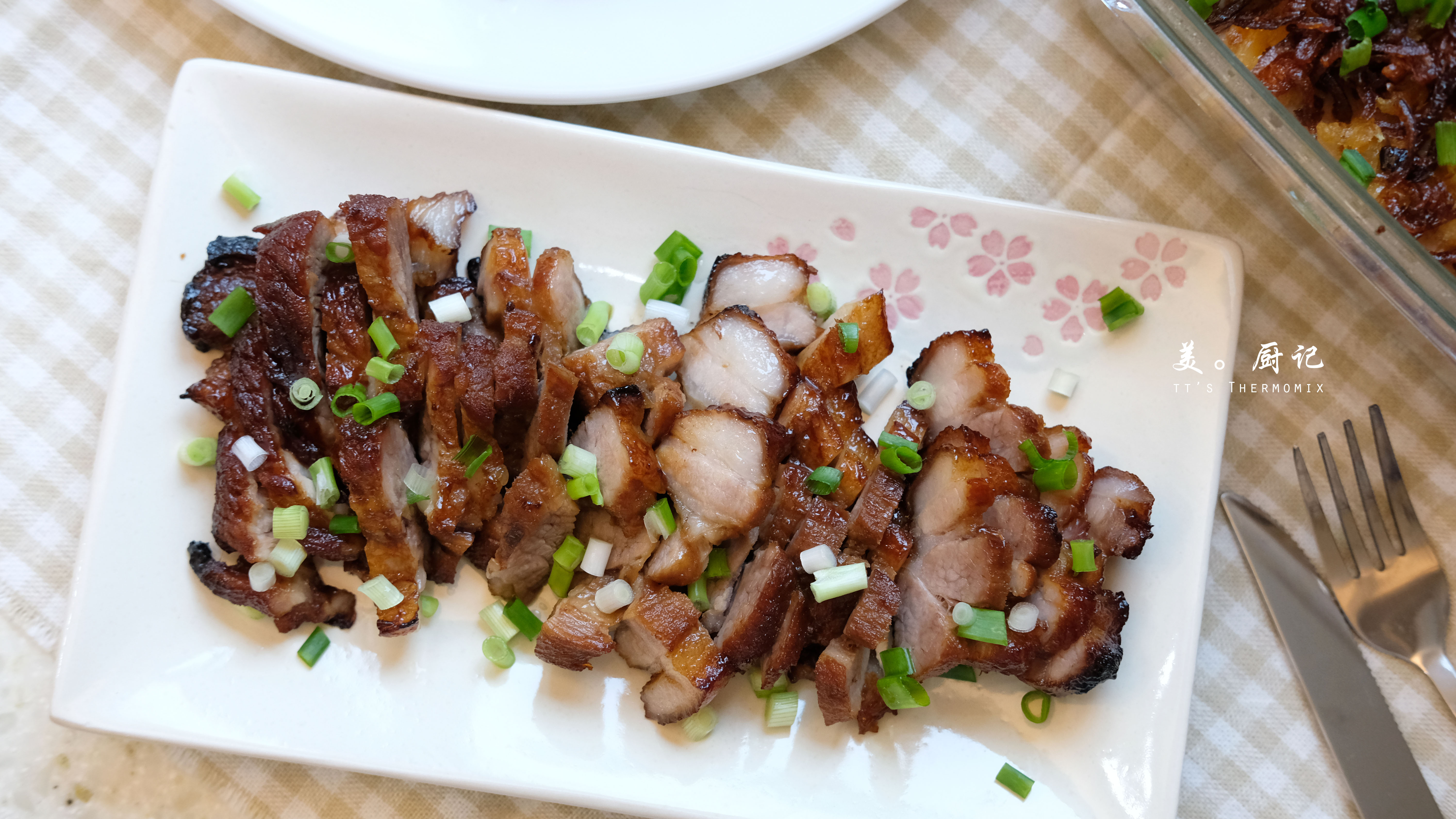 6. 將蔥花撒在叉燒上點綴,跟著將剩餘的醬汁淋在叉燒上即可趁熱享用。