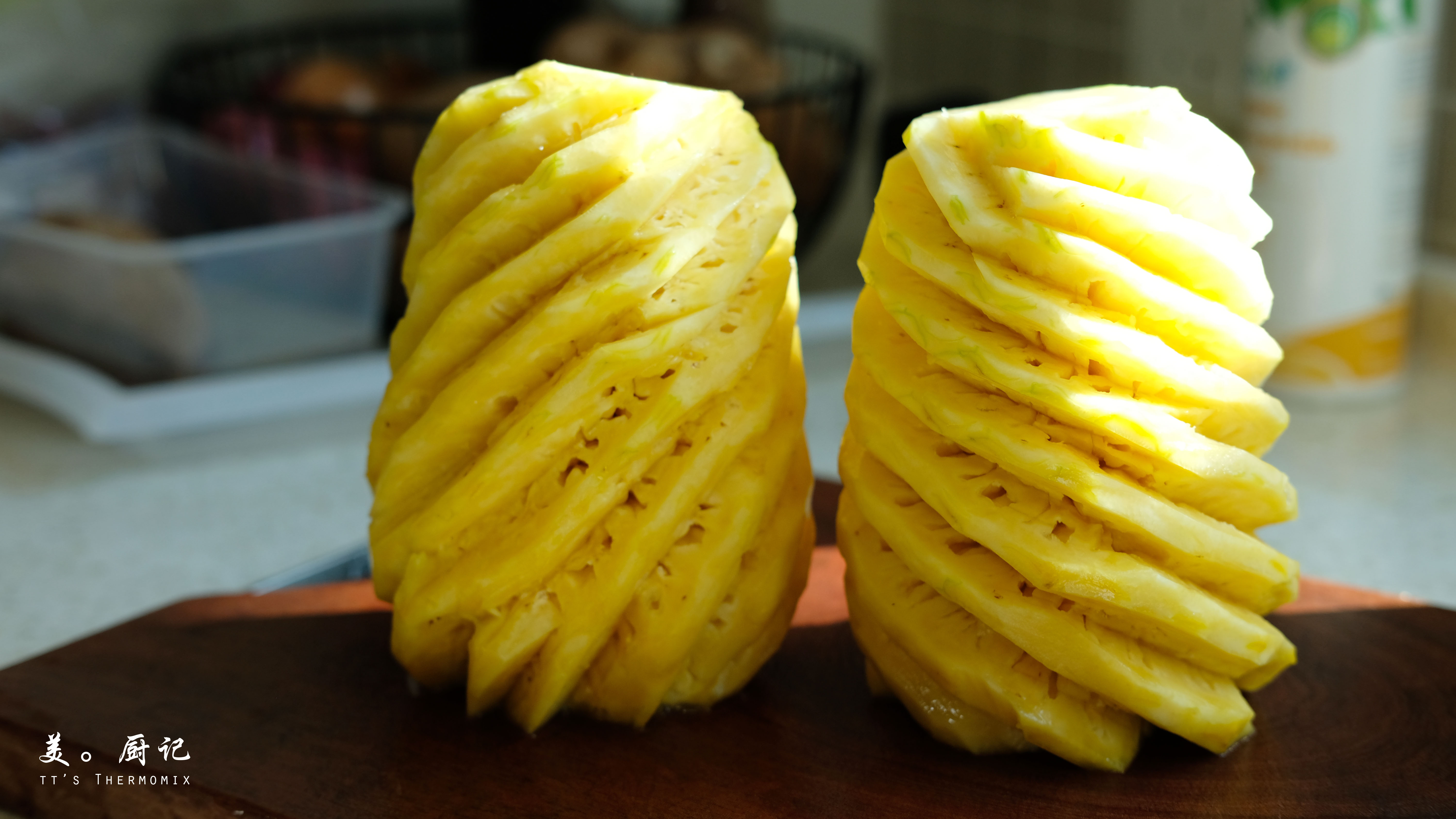 左邊那顆黃梨就是切錯了方向,而右邊那顆的螺旋紋路更顯得清晰完整。