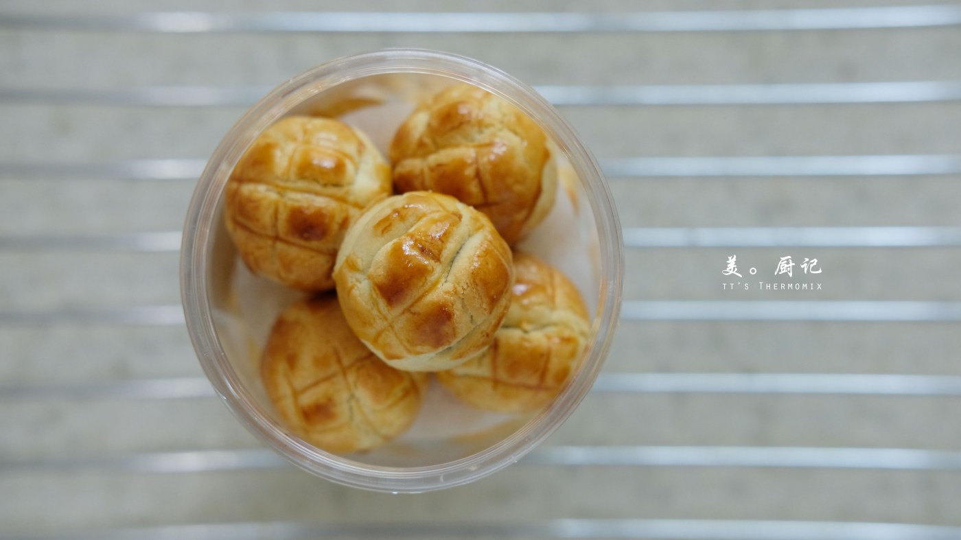 算了,我只好另外硬著頭皮在麵糰裡添加麵粉直到不那麼黏手為止,跟著頭也不回地繼續完成後續包餡整型烘烤的部分。我很喜歡這個表面帶有九宮格簡單造型的鳳梨酥,感覺有點像鳳梨、也有點像太陽花,但又有點像烏龜殼。(^^;;