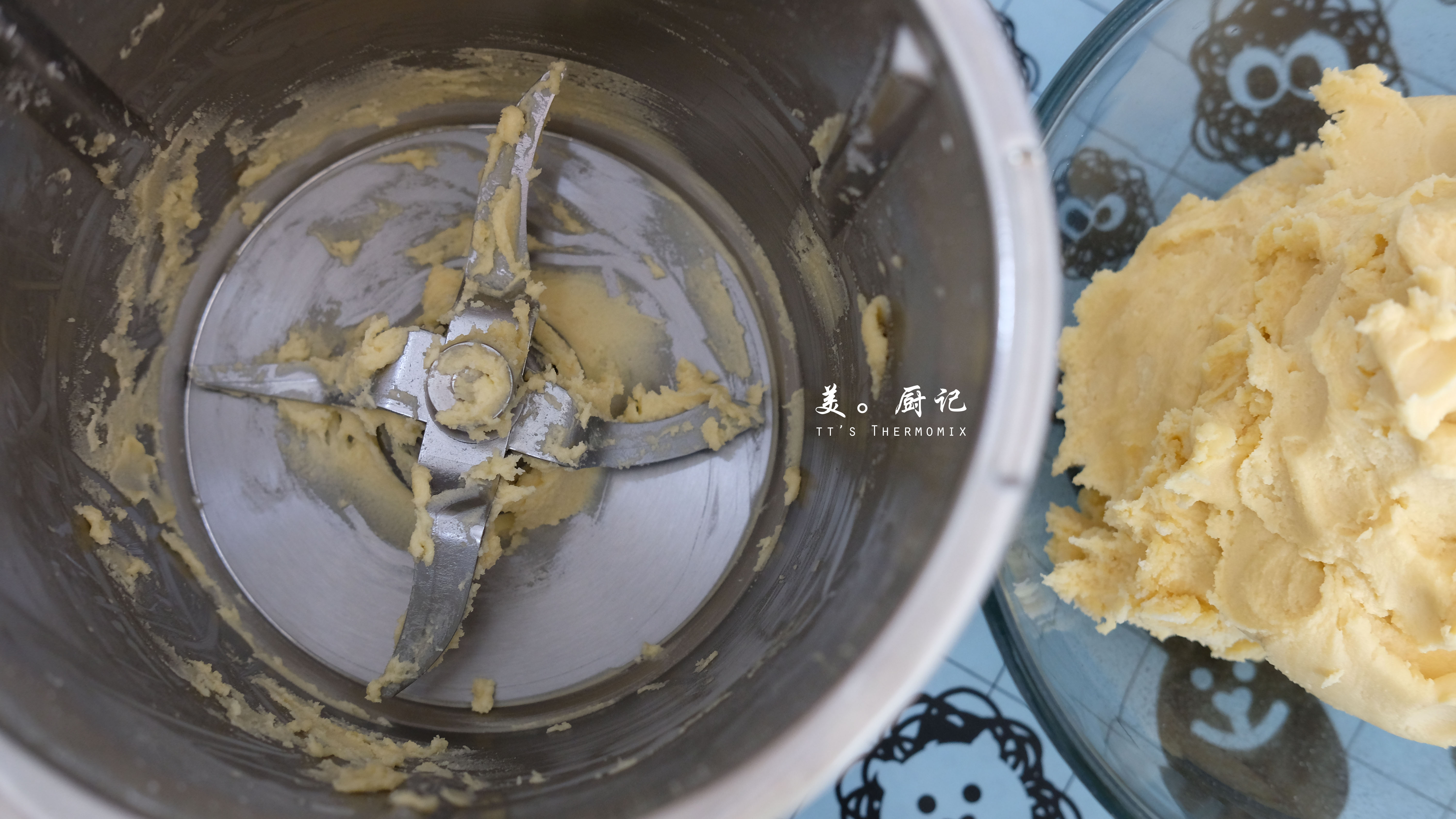 我跟著小美食譜,小心翼翼地將奶油丁、麵粉以及蛋液陸續混合。時間到我發現鍋壁上有很多被刀口推得老高而沒被混合好的麵粉,心想說不如用高速繼續攪拌多30秒好讓麵粉進一步地混合均勻。豈料奶油因為快速攪拌而開始融化出油,麵糰因此而變得非常黏手不好操作。( ・᷄ὢ・᷅ )