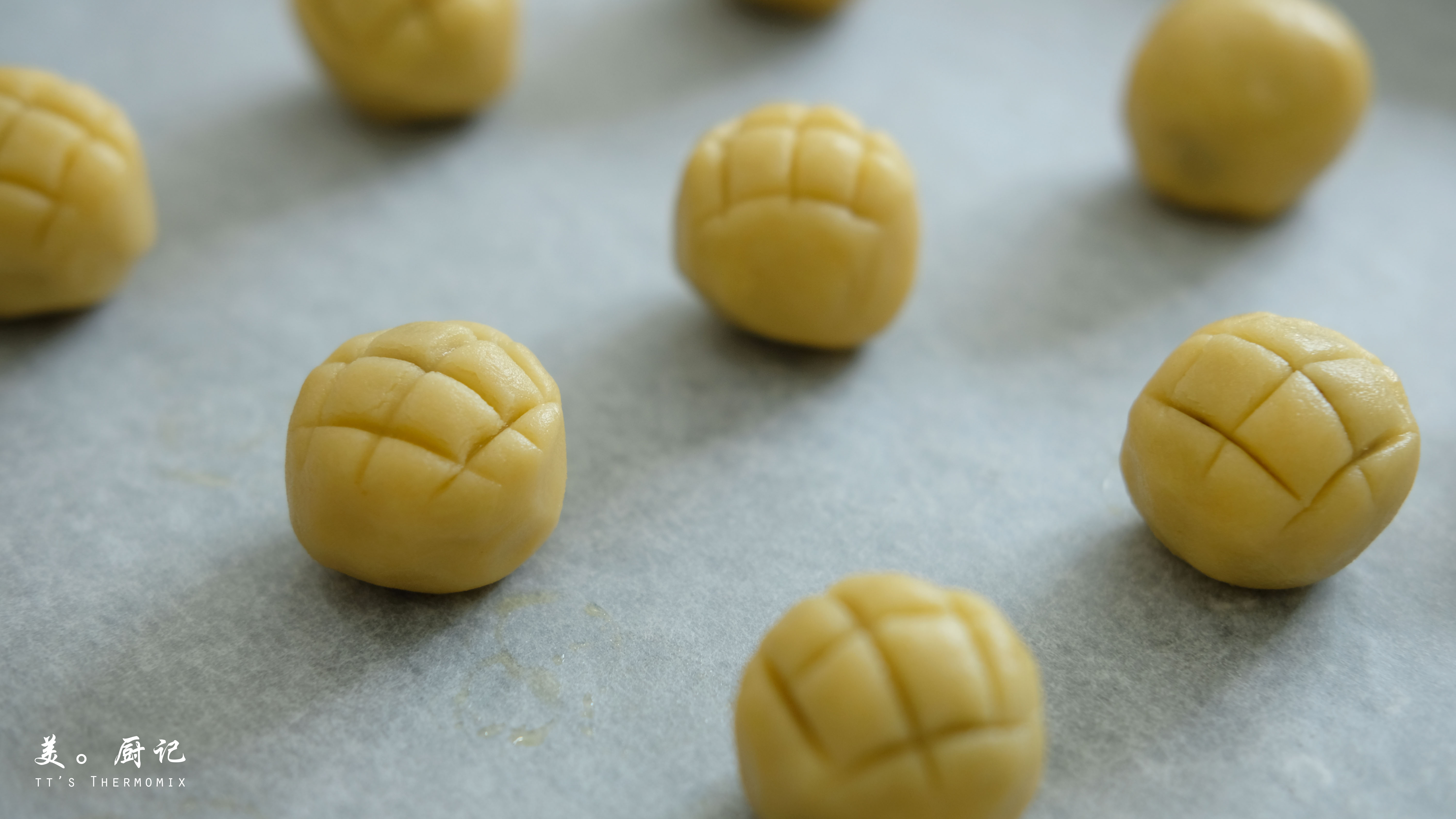 - 用一把塑料刀子在鳳梨酥球的表面上輕輕劃上一個九宮格,跟著平均置入烤盤裡。重複以上同樣動作直到所有餡料用完。