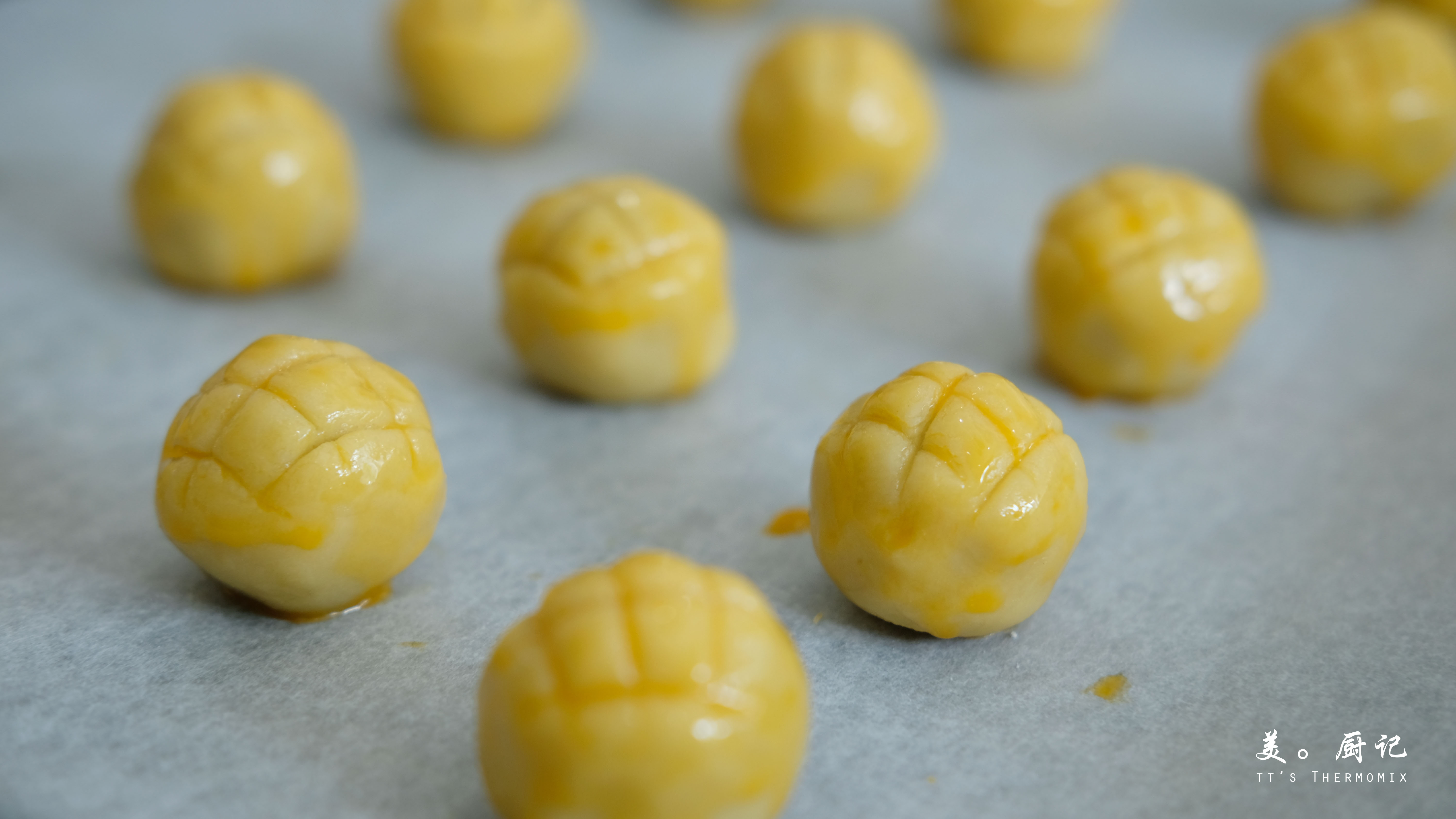 - 烤箱預熱至170°C。將蛋黃和水混合輕輕拌勻,跟著用烘培刷沾點蛋黃水塗抹在鳳梨酥的表面,靜置一會兒讓酥皮將蛋液吸收。
