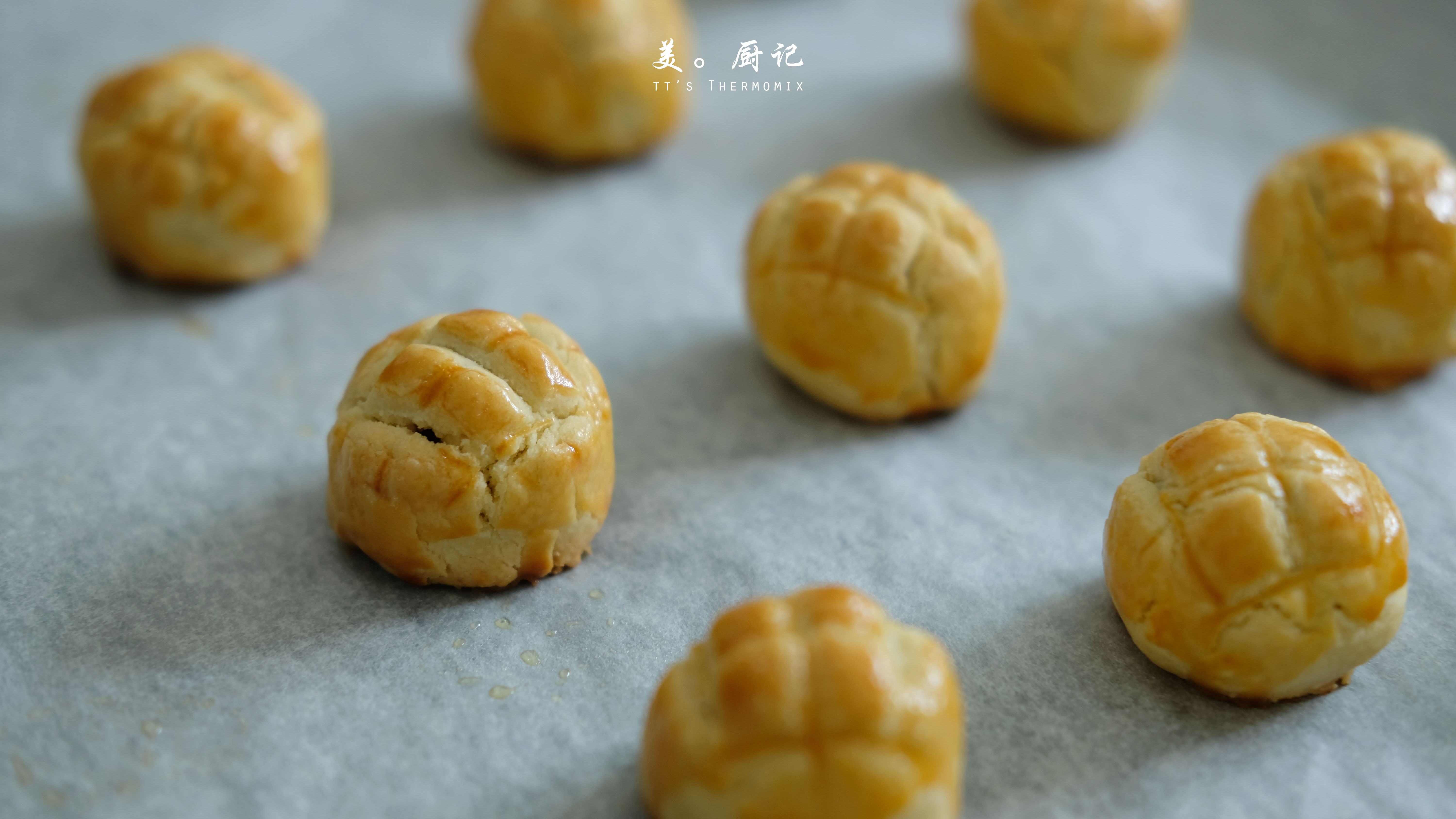 算了,我只好另外硬著頭皮在麵糰裡添加麵粉直到不那麼黏手為止,跟著頭也不回地繼續完成後續包餡整型烘烤的部分。我很喜歡這個表面帶有九宮格簡單造型的鳳梨酥,感覺有點像鳳梨、也有點像太陽花,但又有點像烏龜殼。(^^;;