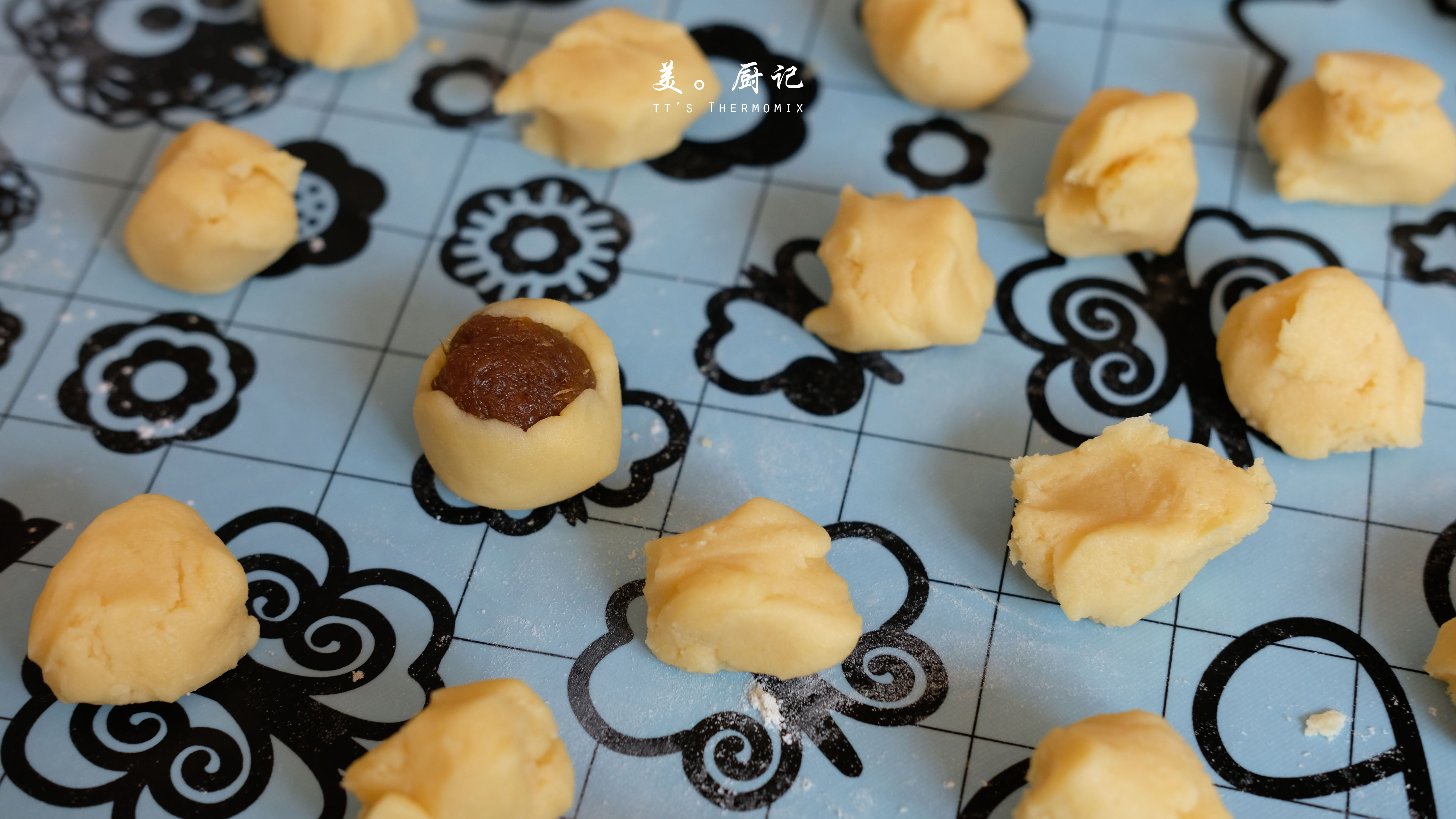 - 取約9g的酥皮用手心搓圓壓扁,裹入一顆黃梨餡跟著揉成小球狀。