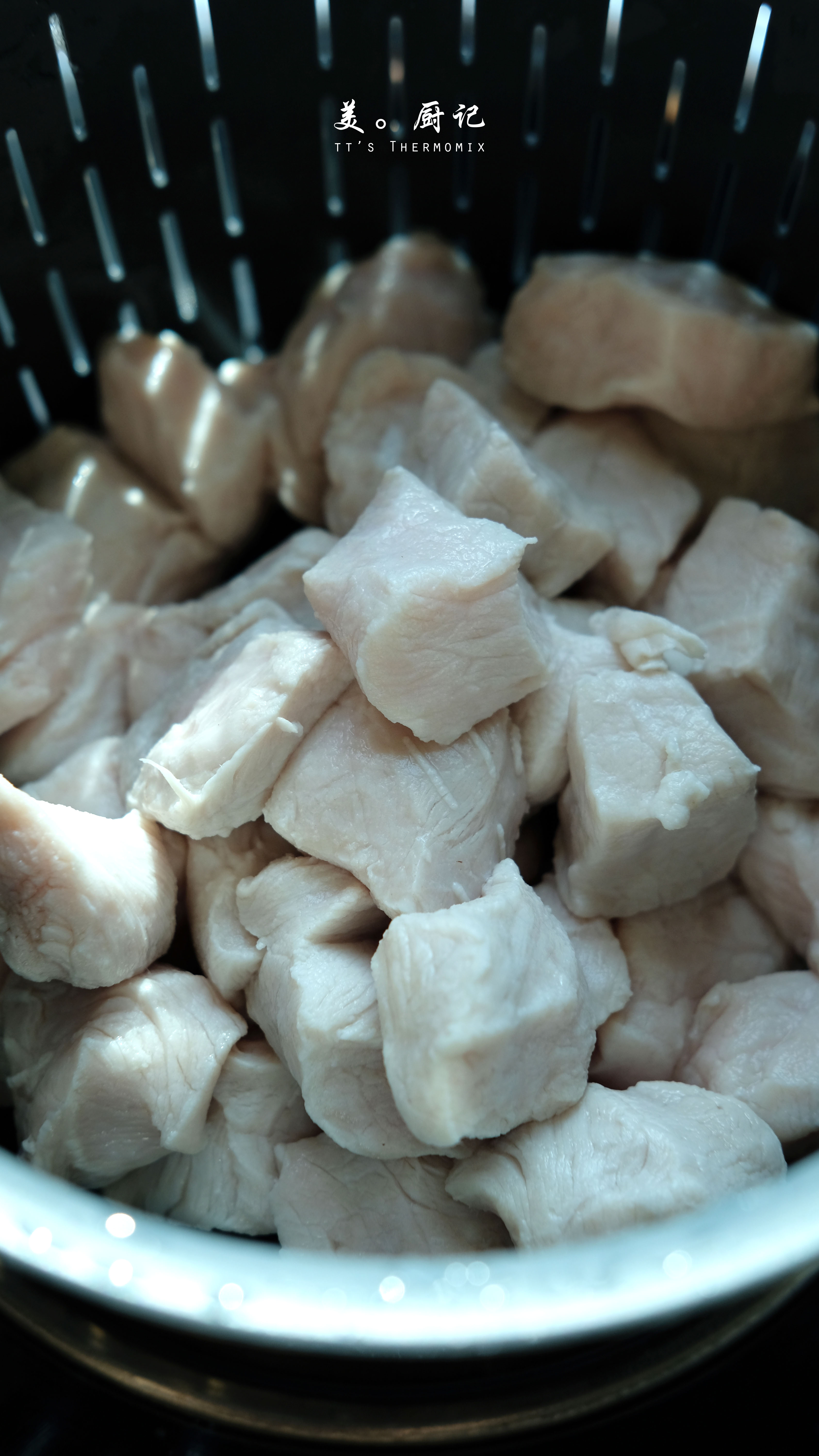 2. 將肉丁放入網鍋裡以【20分/50°C/速度4】跑活水,時間到將肉丁取出洗淨瀝乾水分備用。