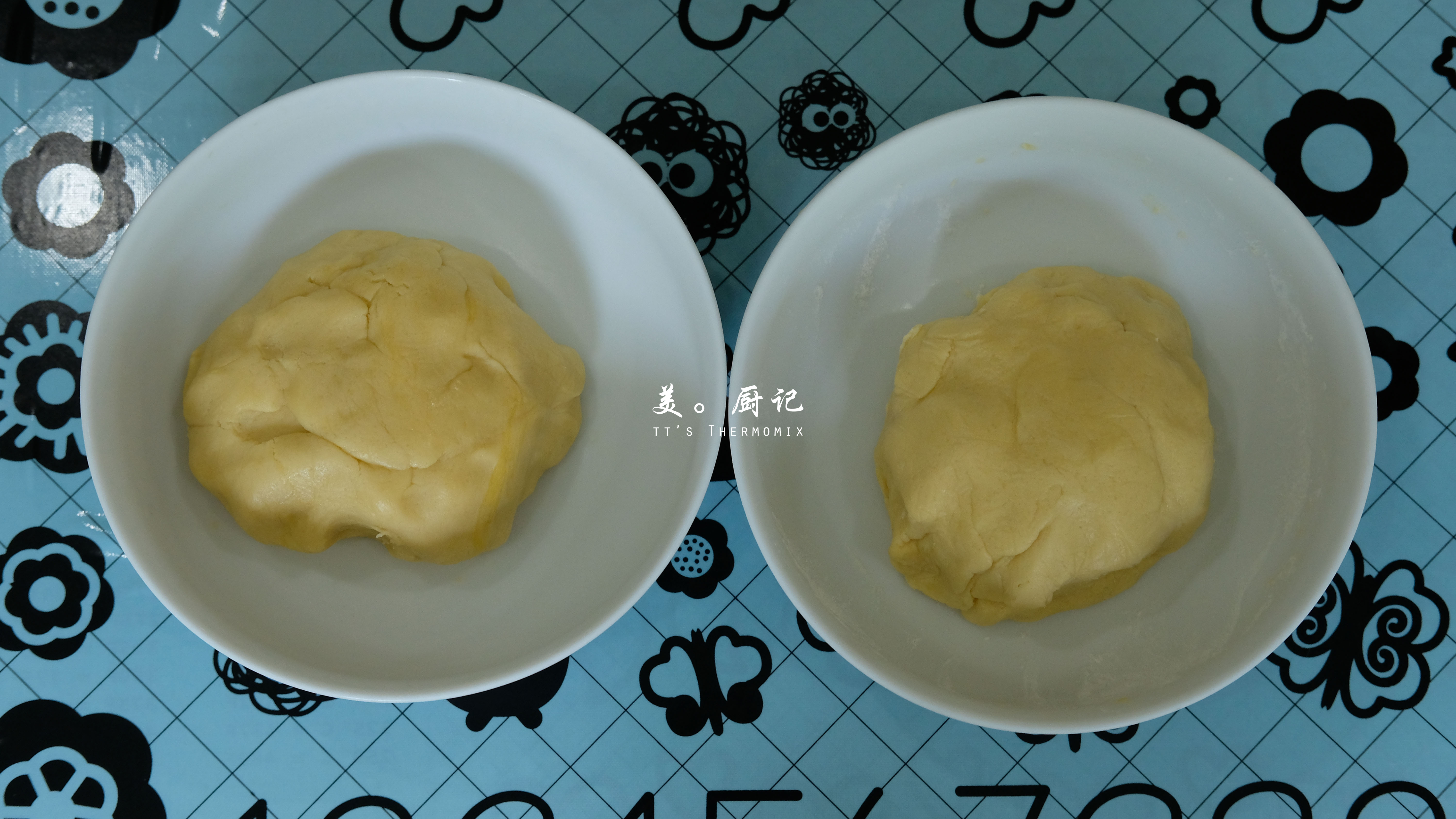 關於酥皮,我私下諮詢了貓媽的意見,心裡有了些譜。同時Maggie媽咪也熱心分享了她最新的酥皮食譜,據說口感是脆脆的哦~ 心想反正一樣要做,乾脆就兩個食譜都減半一起嘗試,看看哪個比較適合自己的口味。^^ 這次的小美酥皮總算操作順利,手感很好不黏手。至於Maggie媽咪的食譜,我覺得打出來的麵糰太過濕黏沒辦法壓模,最後只好自己加了些粉再繼續開工。(^^;;