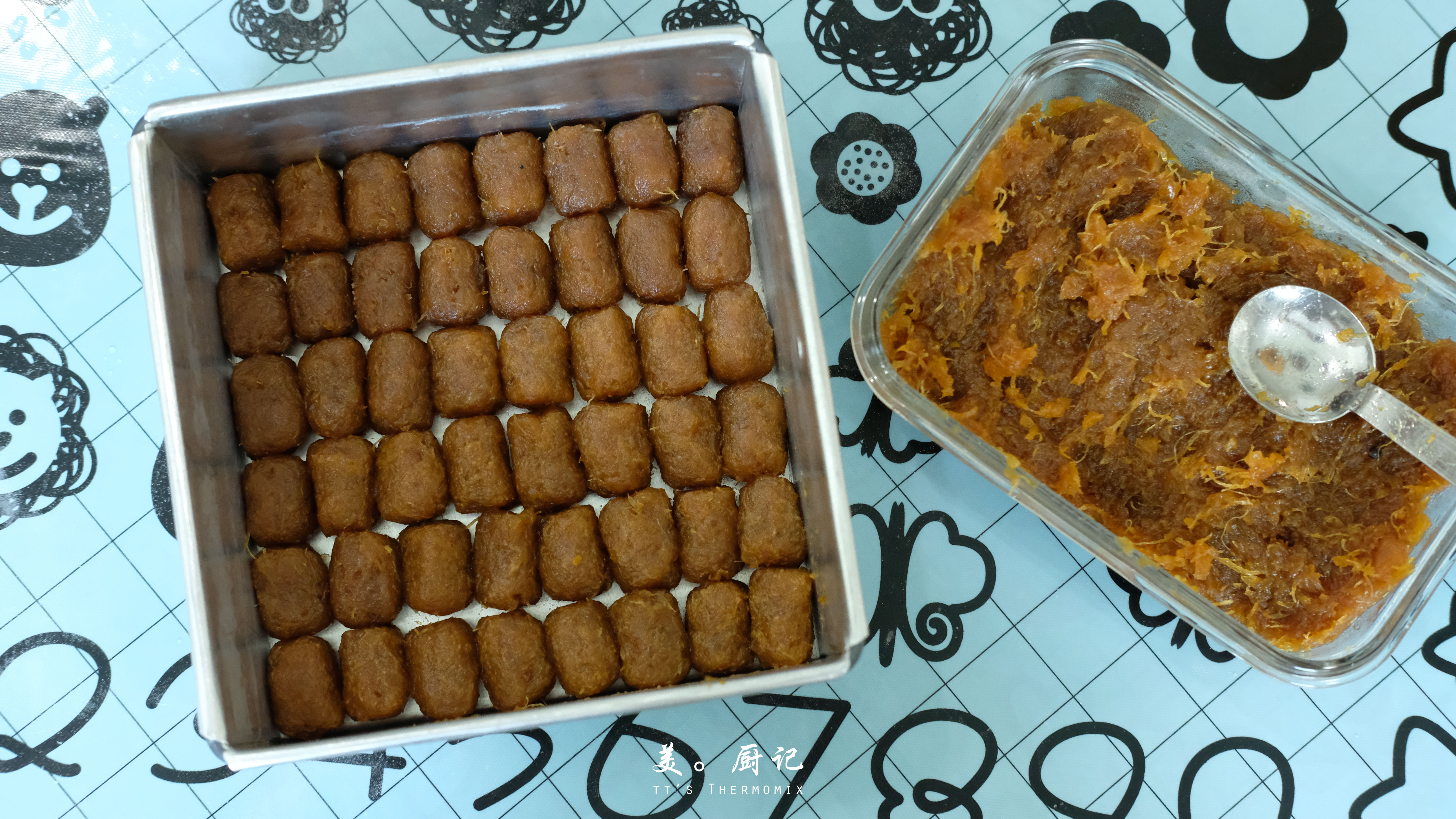至於黃梨餡,這次我加碼一口氣炒了三顆大黃梨,果肉總重2160g,是接近小美2200g滿鍋的份量!一開始我還在猶豫會不會太滿擔心會有嚴重溢鍋的情況,後來想想不管了,乾脆就煮一次看看。呵呵,結果小美再次證明給我看,沒有什麼是難得倒她的!接近滿鍋的黃梨果肉,出來有840g美美的黃金餡料哦!(^з^)