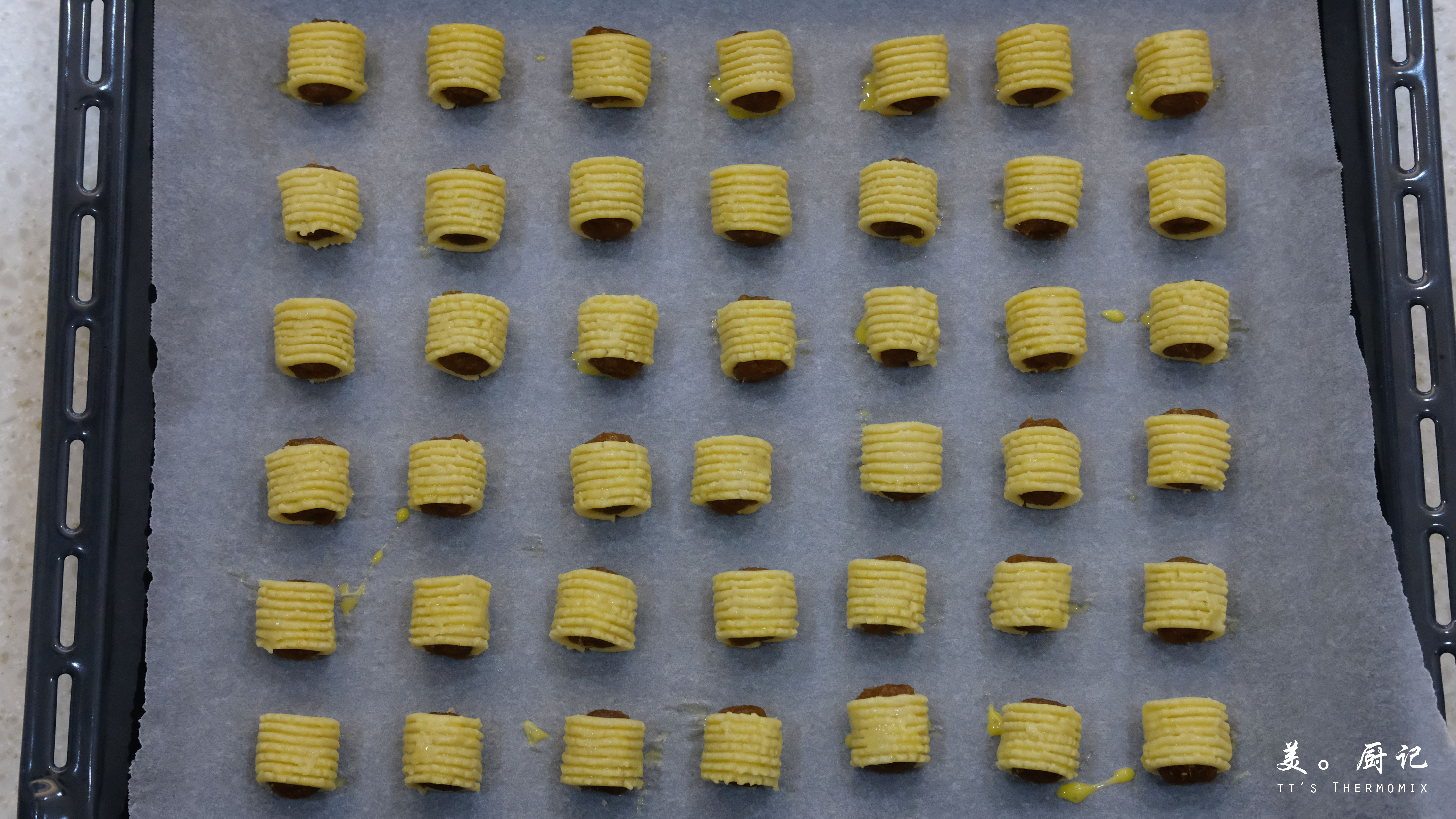 - 烤箱預熱至170°C。將蛋黃和水混合輕輕拌勻,跟著用烘培刷沾點蛋黃水塗抹在鳳梨酥的表面,靜置一會兒讓酥皮將蛋液吸收。