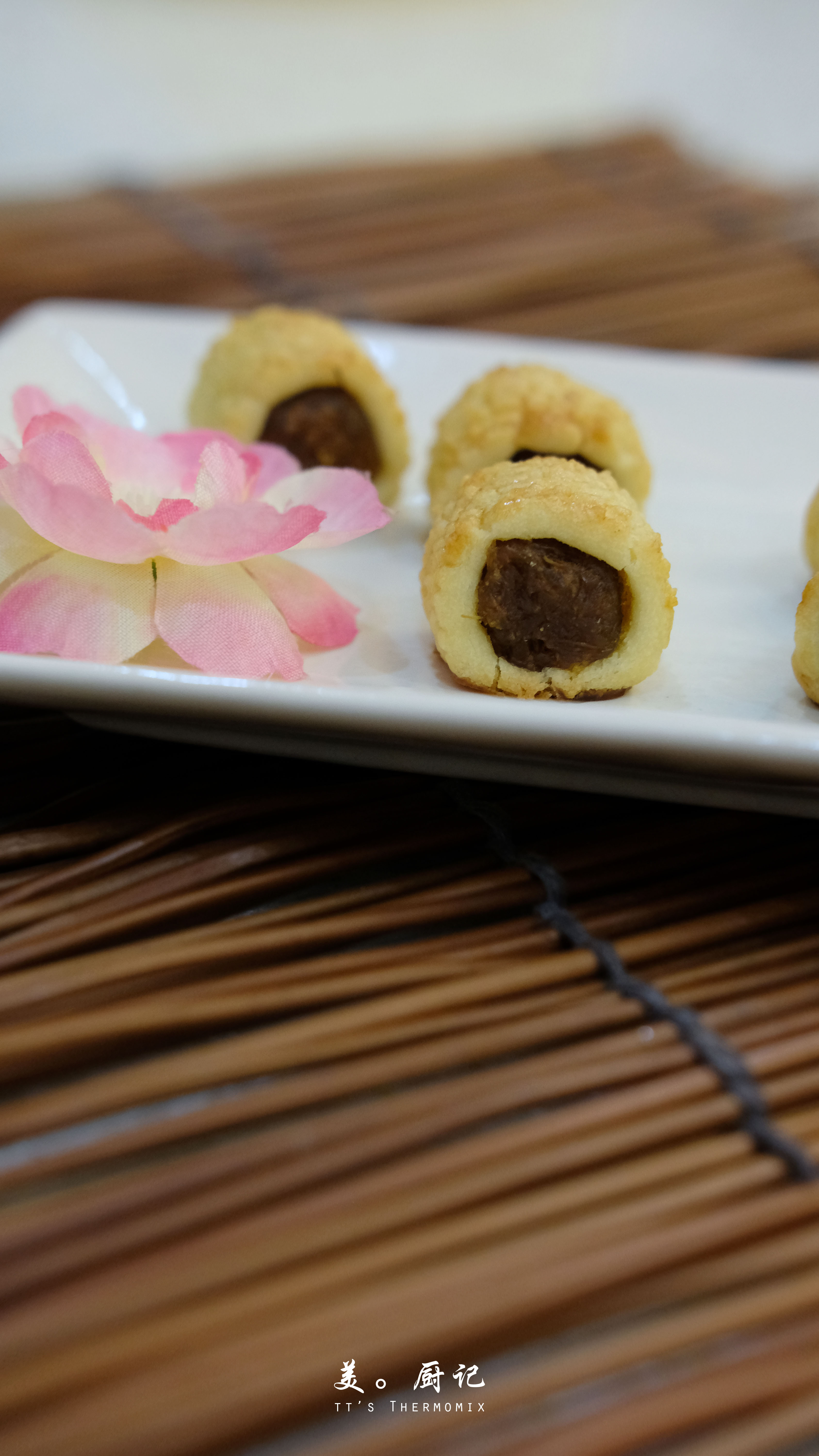 - 將冷藏的黃梨餡取出,全部捏成約7g的橢圓小球備用。