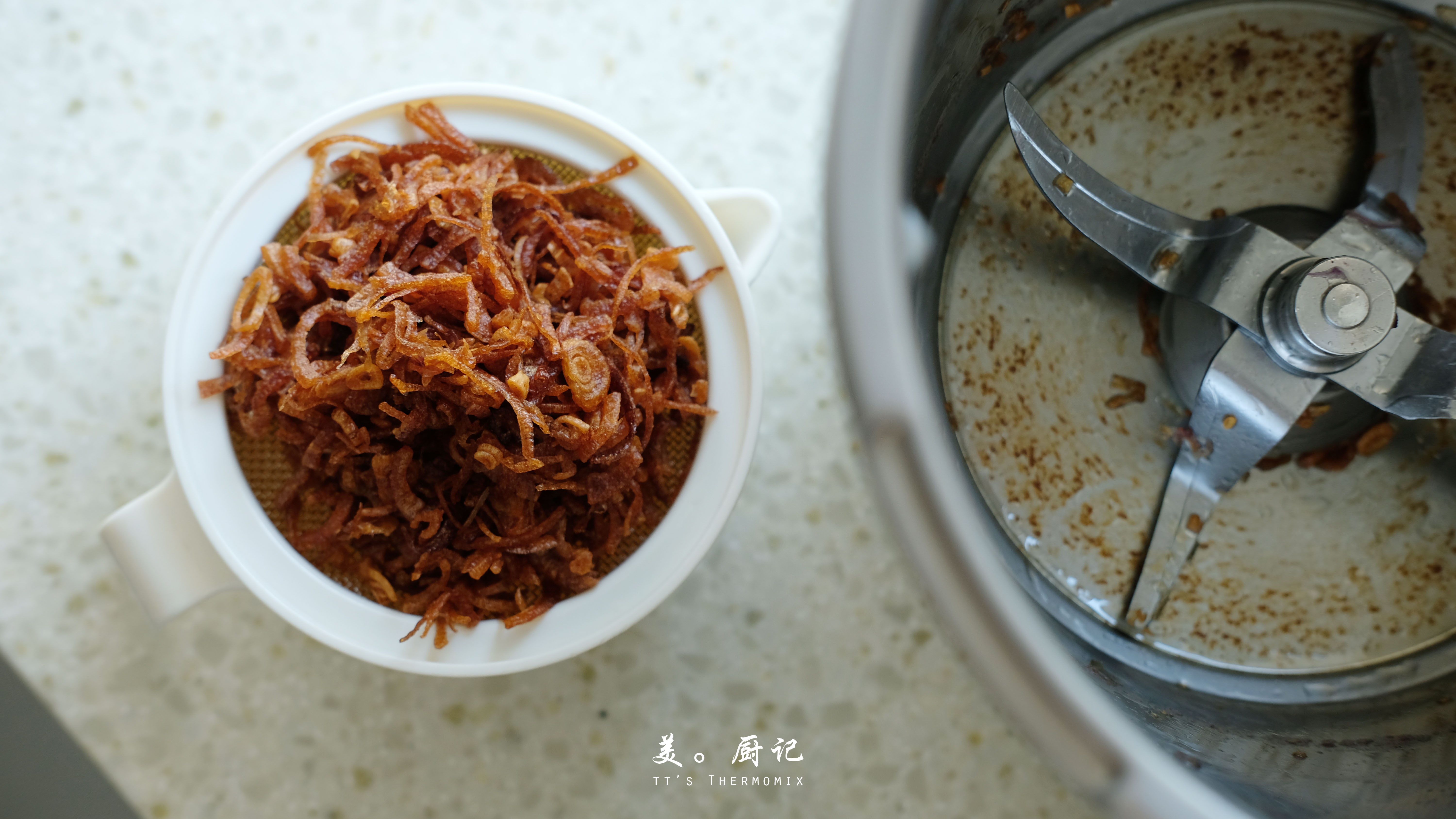 - 中途暫停一下,用刮刀將卡在刀組上的紅蔥頭鬆開,跟著繼續拌炒至油蔥酥呈金黃色酥脆為止。