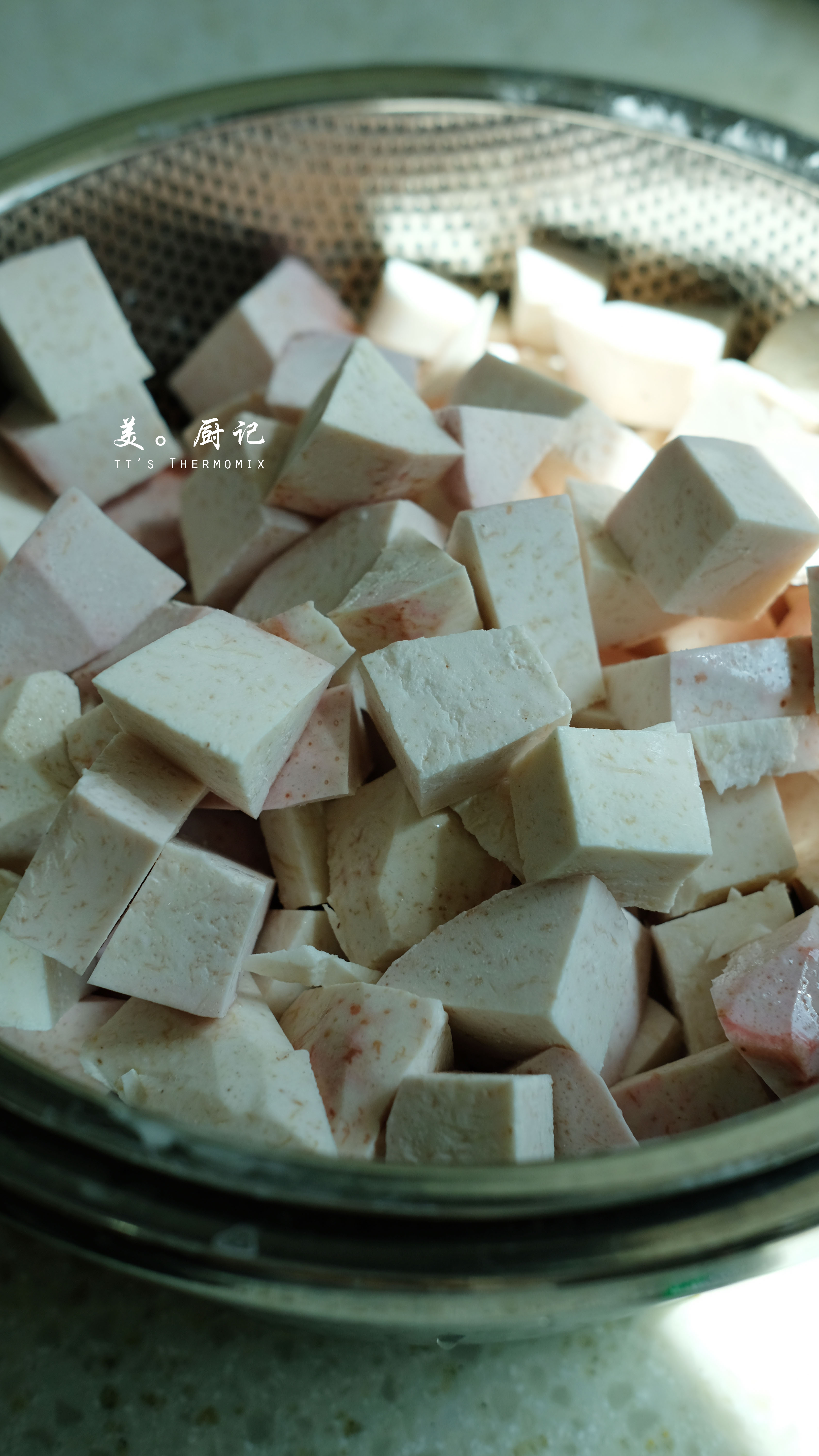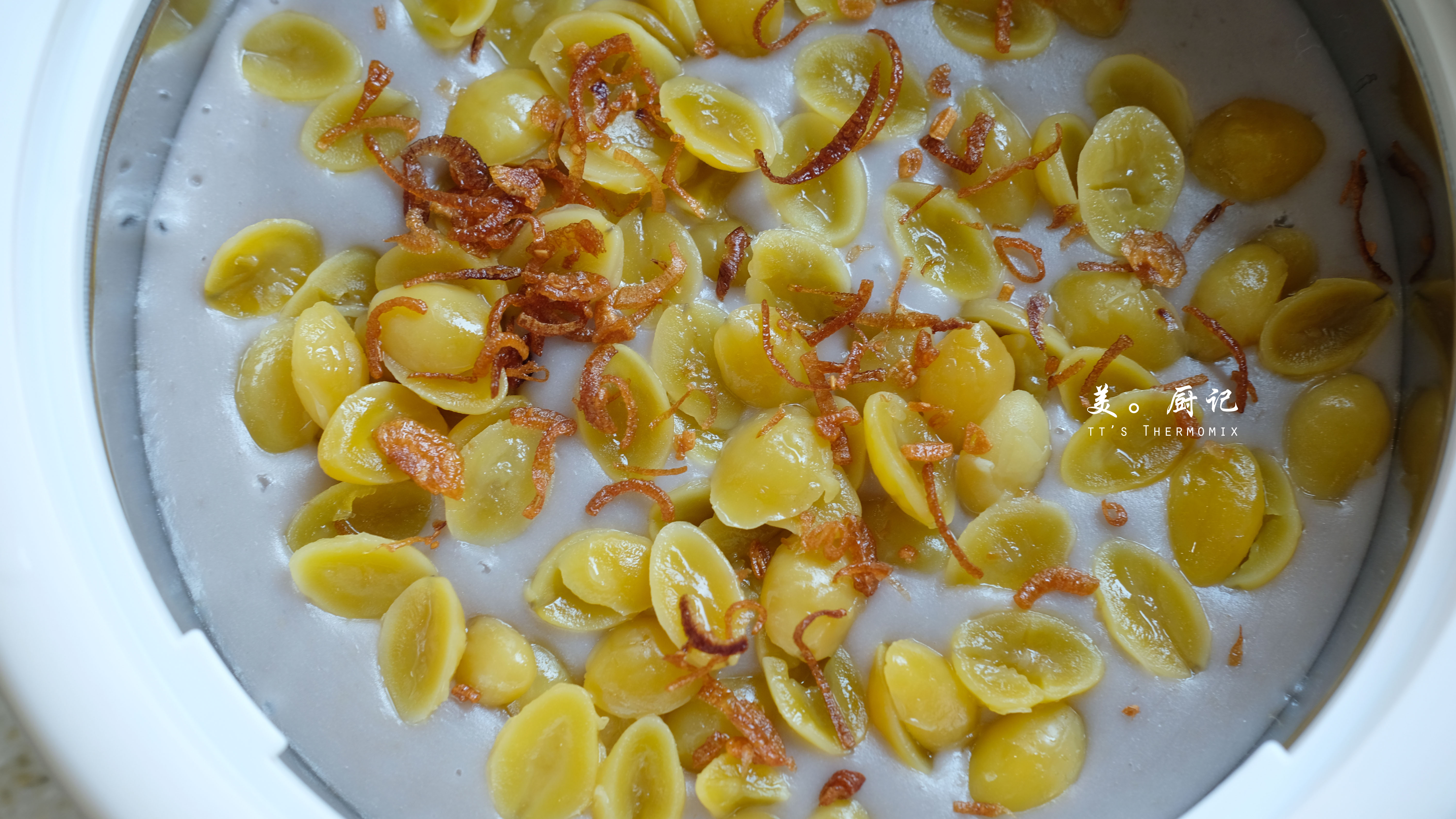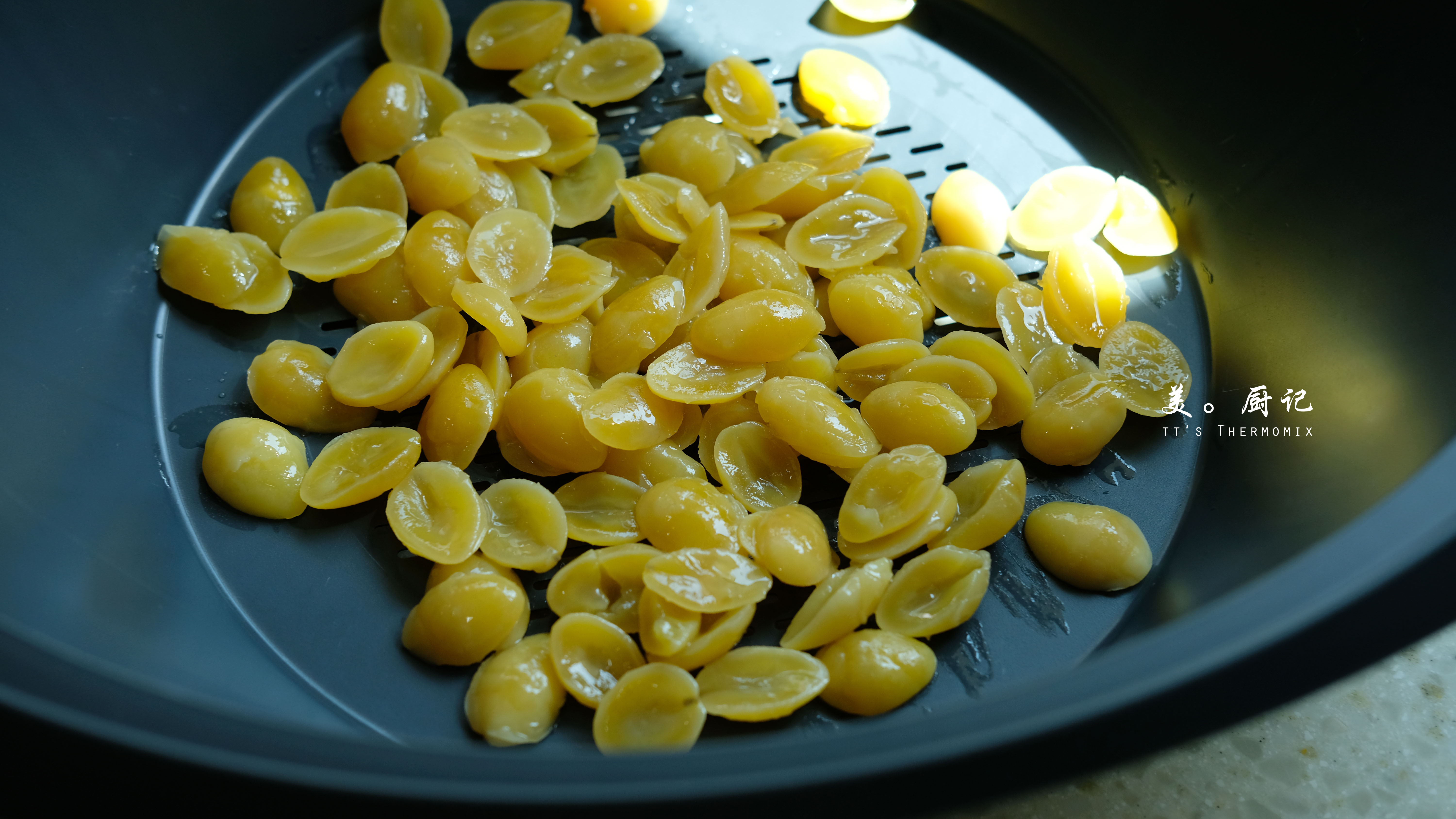 - 將芋頭與清水倒入主鍋內,以【15分/Varoma/速度2】進行蒸煮。最後5分鐘架上作法1的蒸鍋將糖漬白果翻熱。