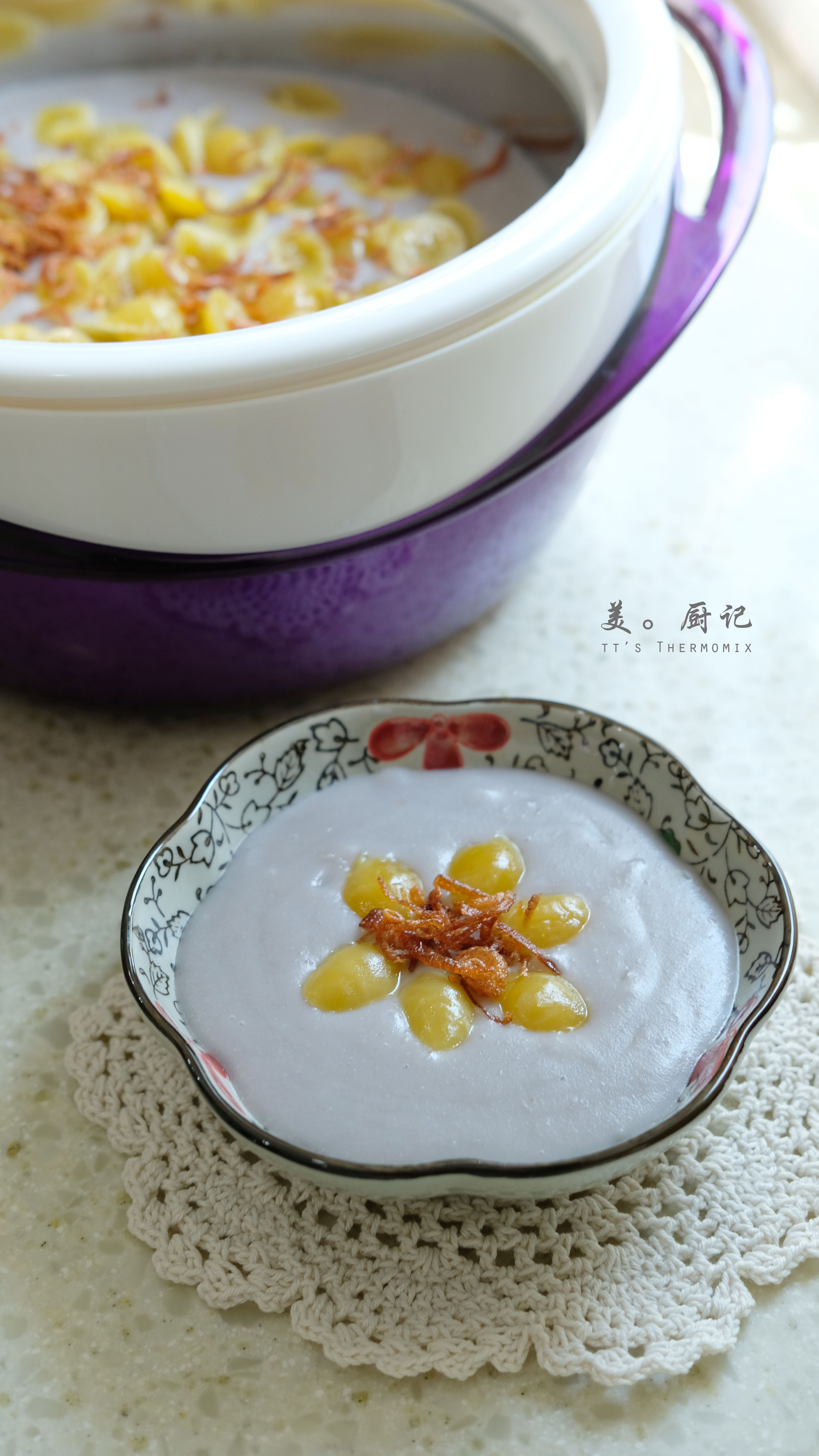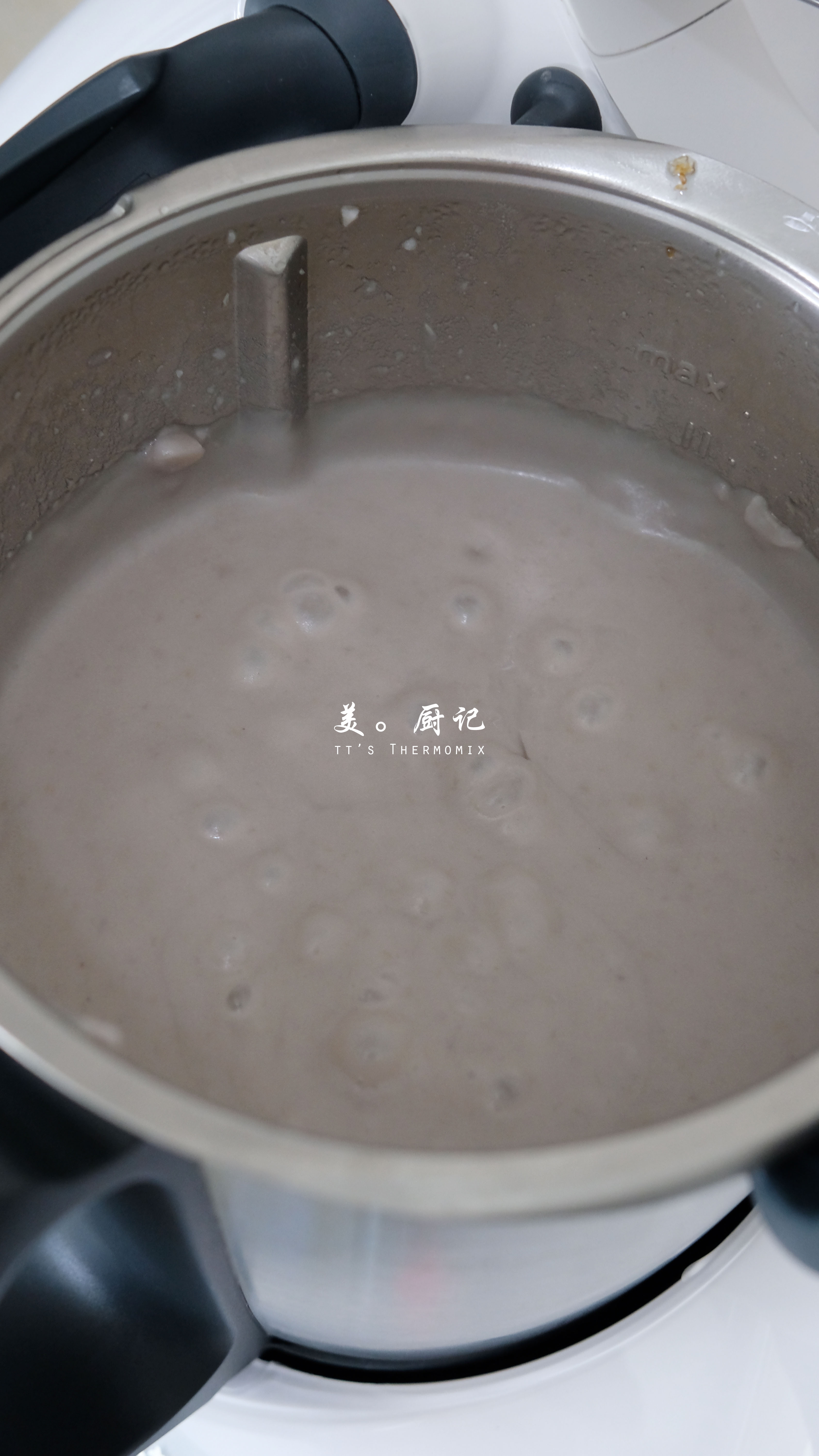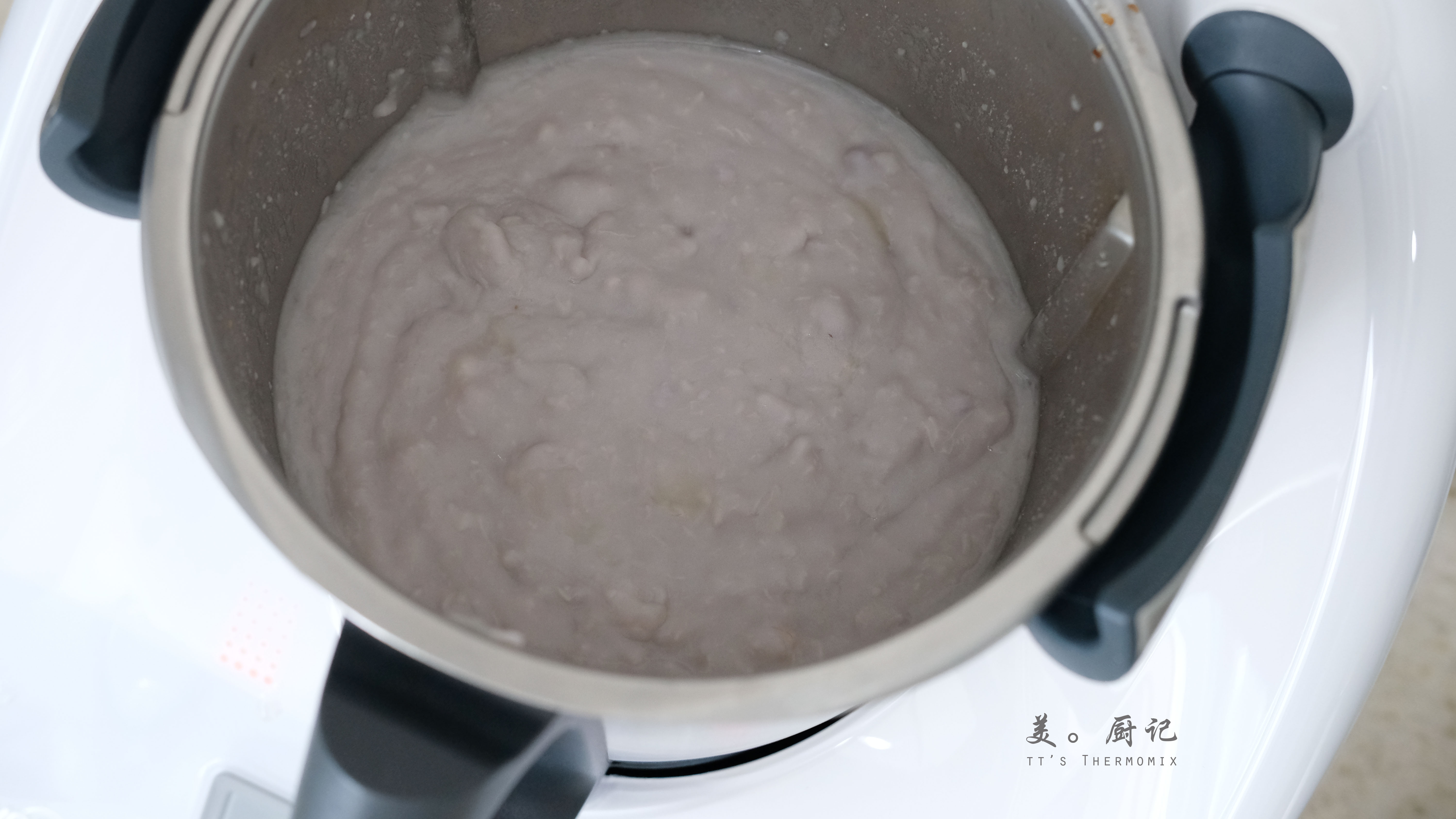 - 時間到移除蒸鍋,將蔗糖和蔥油加入主鍋內,以【1分鐘/速度6-10】逐漸加速攪拌,把芋頭打成順滑的芋泥。