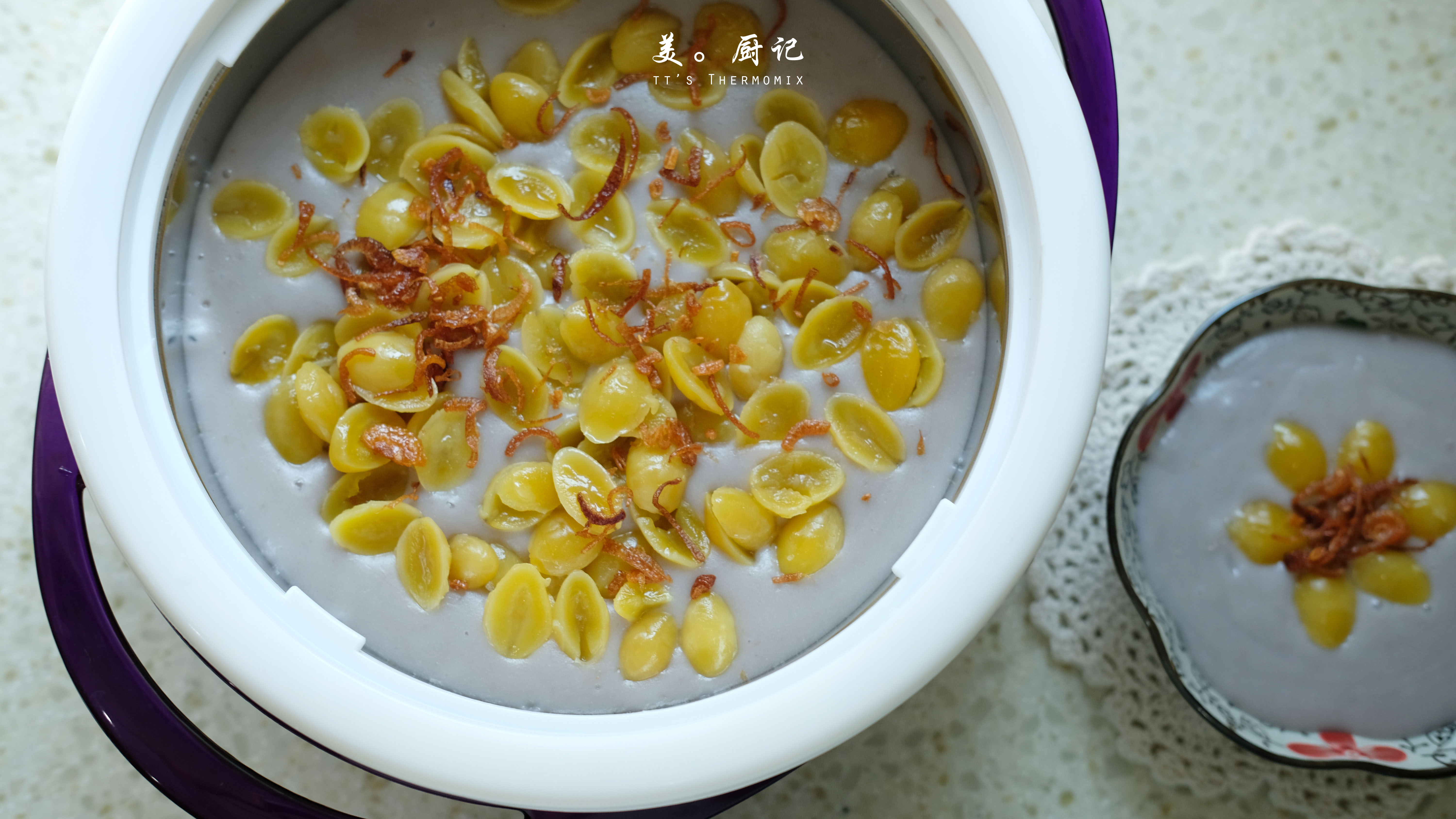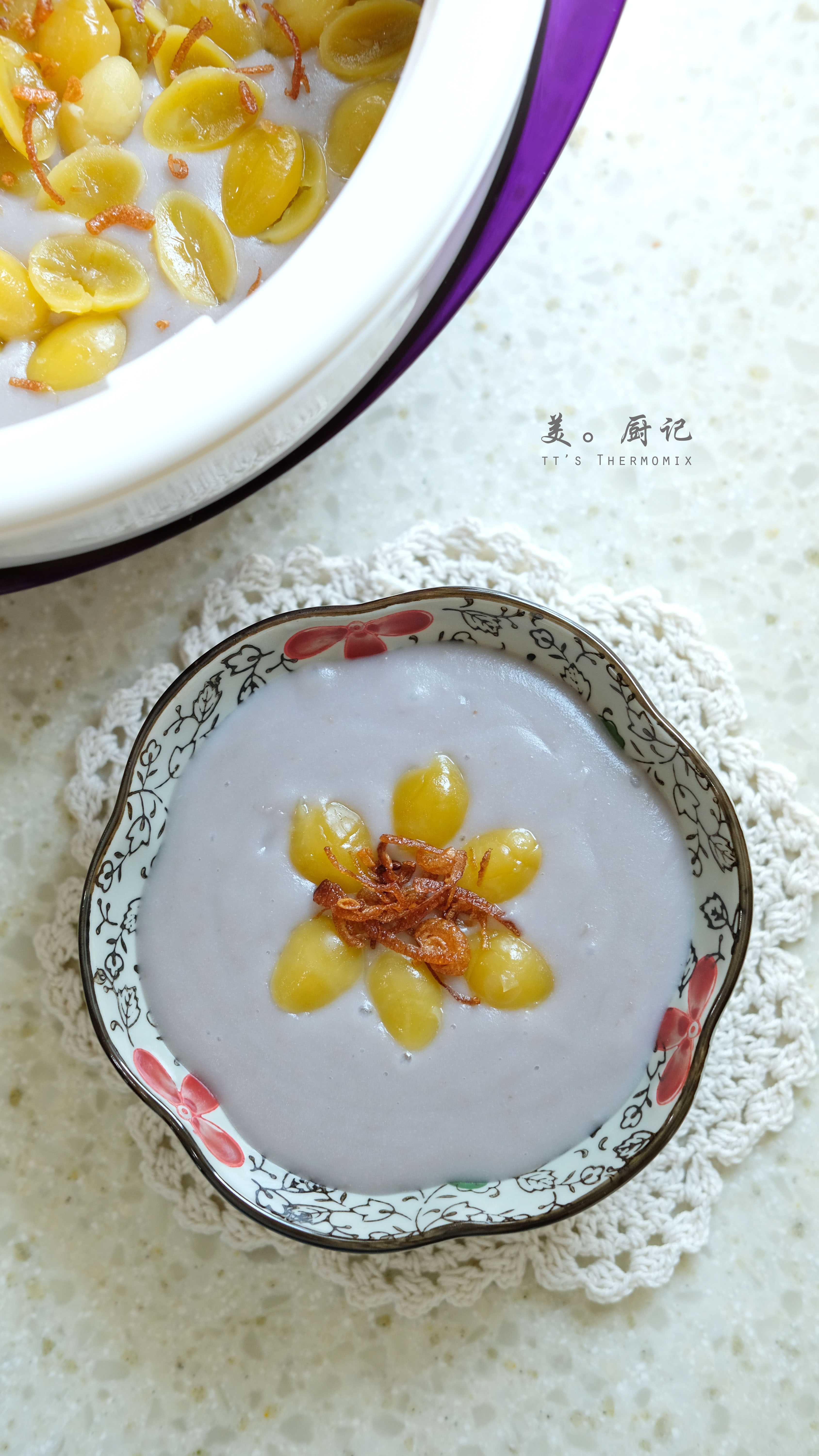 - 將芋泥盛起,撒上糖漬白果以及油蔥酥,拌勻後即可趁熱享用。