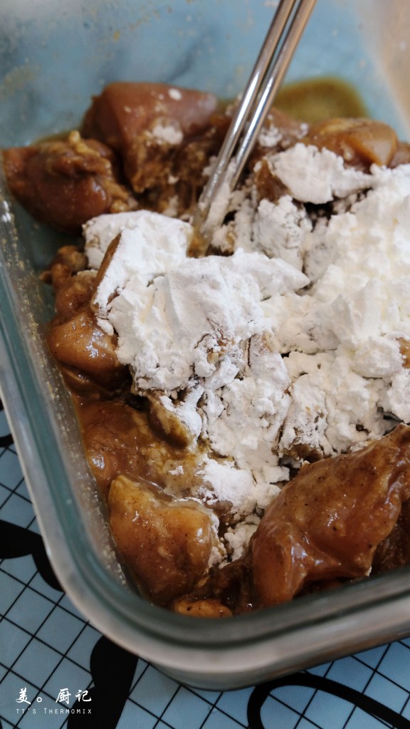 3. 將作法2的雞肉由冰箱取出,加入玉米粉用筷子拌勻,靜置一會兒讓玉米粉返潮,同時將烤箱預熱至190°C。