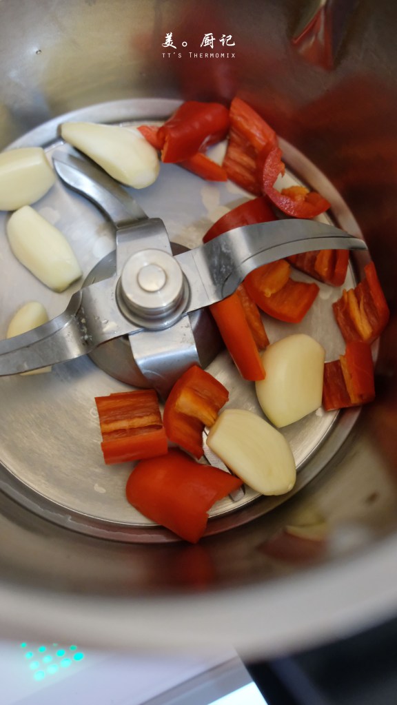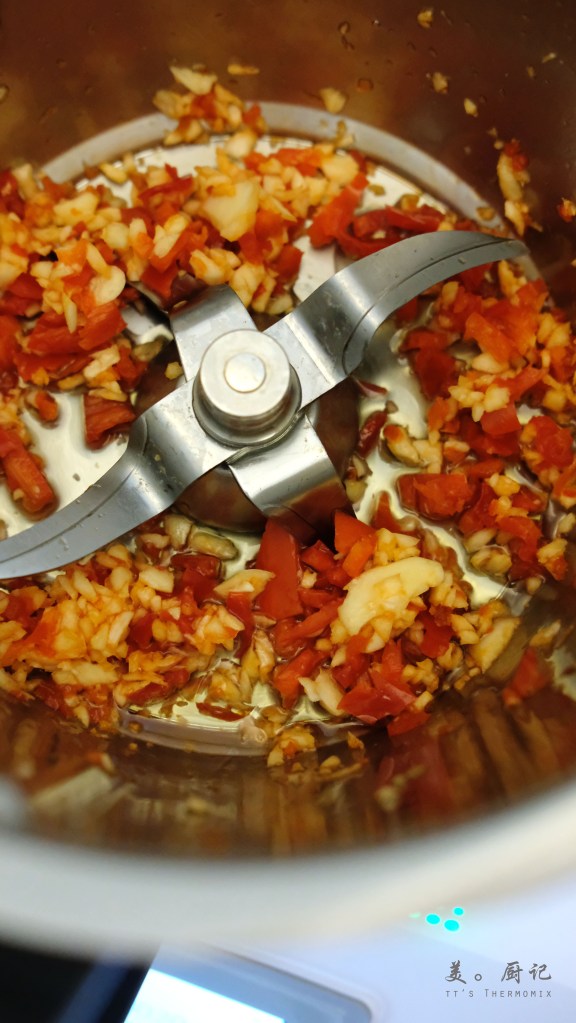 5. 將蒜頭和紅辣椒倒入主鍋內,以【5秒/速度5】切碎,時間到用刮刀將鍋壁上的碎塊刮至鍋底。