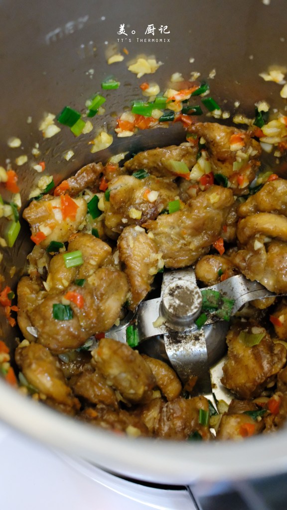 7. 當作法6就快完成,將設定調整為【10秒/反轉/小勺柔速】,將作法4的烤雞肉塊由主鍋蓋口處倒入,跟著加入黑胡椒粉、白胡椒粉和鹽。最後3秒加快至速度2進行顛鍋即可。