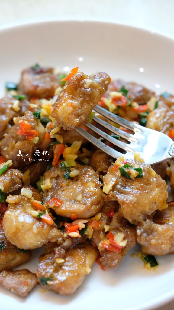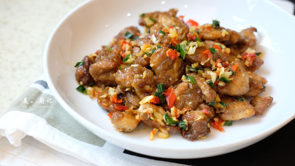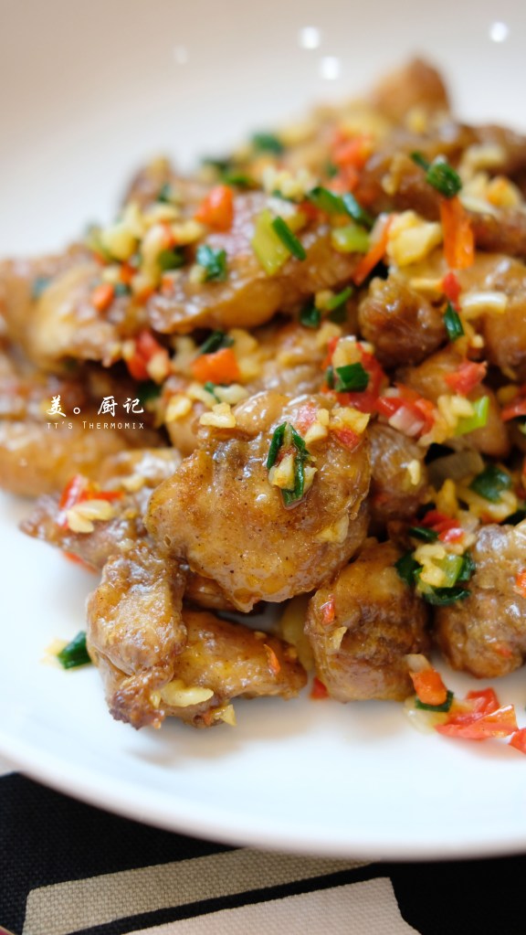 椒鹽料理對我來說一定要用大火炒得乾乾的鍋氣十足才算好吃,這點對低溫烹煮的小美來說無疑是一項挑戰。為了製造出大火乾炒的效果,我這次改用開蓋的方式爆香,好讓水氣隨著鍋蓋口散發而不是倒流鍋內。另外為了保持酥炸的口感,我在最後加入雞丁時并沒有設定溫度,想說就利用主鍋的餘溫快速拌炒一下就好。