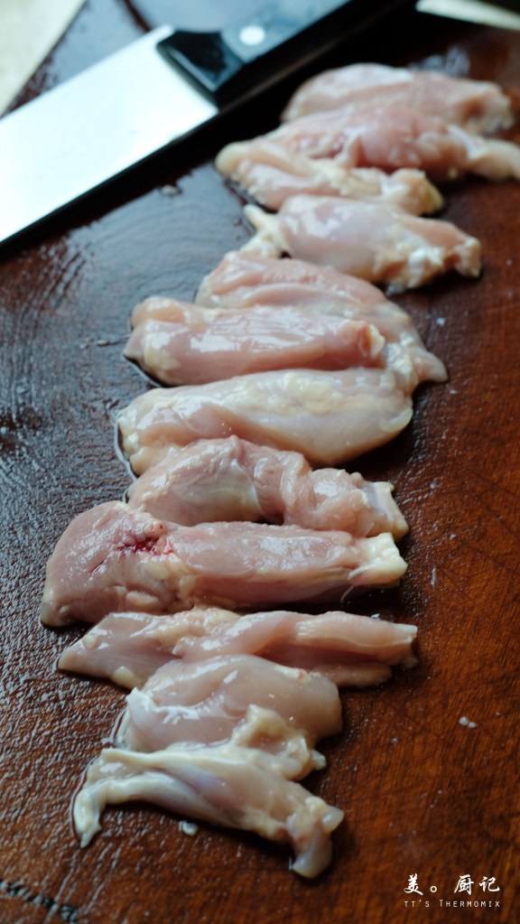 將雞腿肉順著肌肉的紋路切成條狀