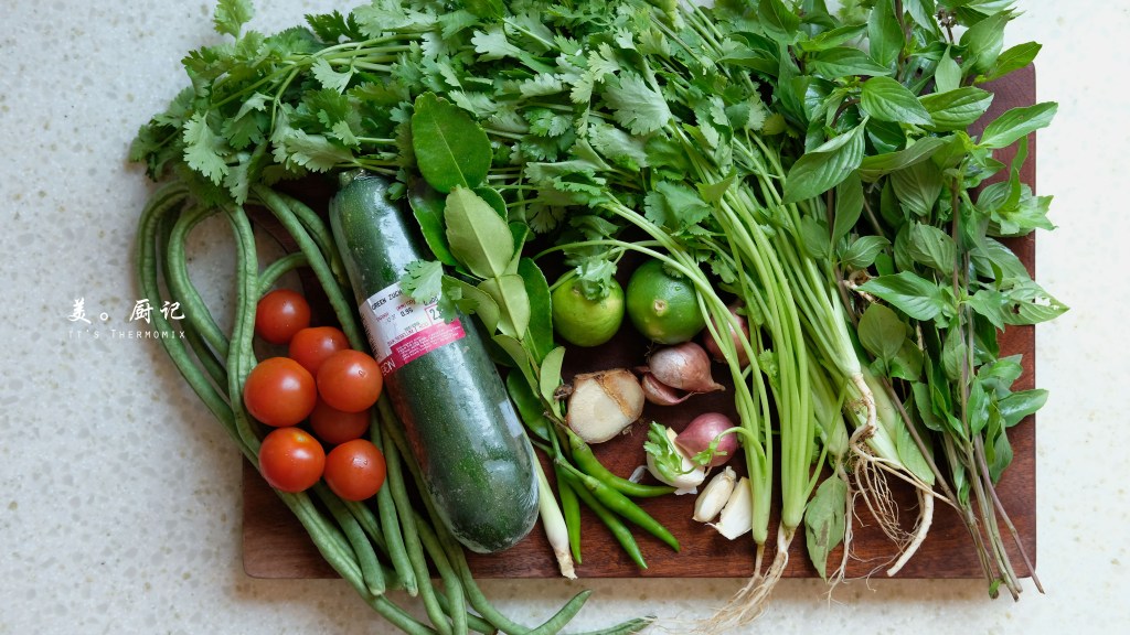 前幾天秉爸突然問起說,之前幫我由泰國購得的各式泰式咖哩怎麼不見我煮。好吧~這兩天我便抽時間來煮煮看。正當我取了一包綠咖喱醬出來研究著怎麼煮的時候,突然想起了《食尚亞洲》裡恰恰有一道泰式綠咖喱雞的食譜。有了小美以後,我特別想嘗試各種原汁原味的美食製作。儘管食譜裡的食材與辛香料像一匹布那樣長,我還是鼓起了勇氣,上菜市場一輪刮搜買了一大袋的新鮮食材回家。^^
