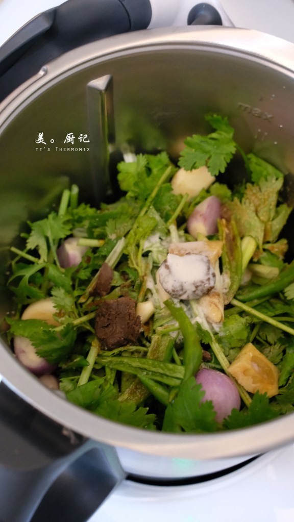 不過後來我參閱其他食譜,發現傳統泰式綠咖哩醬一般是以大量的綠色指天椒用研缽搗碎的方式研磨取色。至於芫荽,主要只是取其根鬚的部分,偏偏我想也沒想就直接將那最珍貴的芫荽根部切除,難怪最後成品感覺好像少了點什麼。(/ω\) 食譜裡還有一個我生平從未煮過的材料~蝦醬峇拉煎。呵呵,有了小美後,我對一眾食材的認識與接受度真是開闊提升了不少啊~σ^_^;