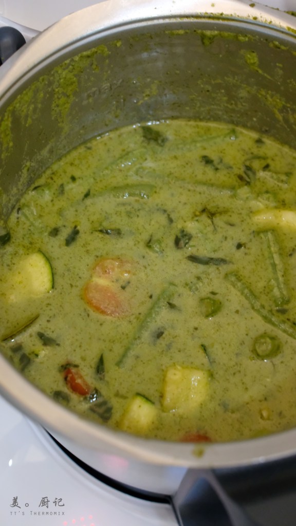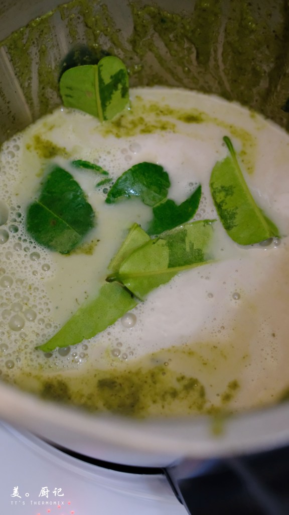 - 加入材料C的椰漿、清水與瘋柑葉,設定【12分/100°C/反轉/小勺柔速】,啟動後將作法1醃製好的雞肉由主鍋蓋口加入進行烹煮。時間剩下7分鐘時,加入夏南瓜與長豆,繼續烹煮。