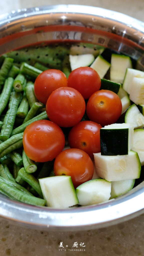 - 原食譜在步驟6有另外加入青椒連同櫻桃番茄以1分鐘/Varoma烹煮。剛好我家沒有青椒所以省略了,至於櫻桃番茄,我不喜歡過於軟爛的口感,所以改在最後20秒才加入烹煮。